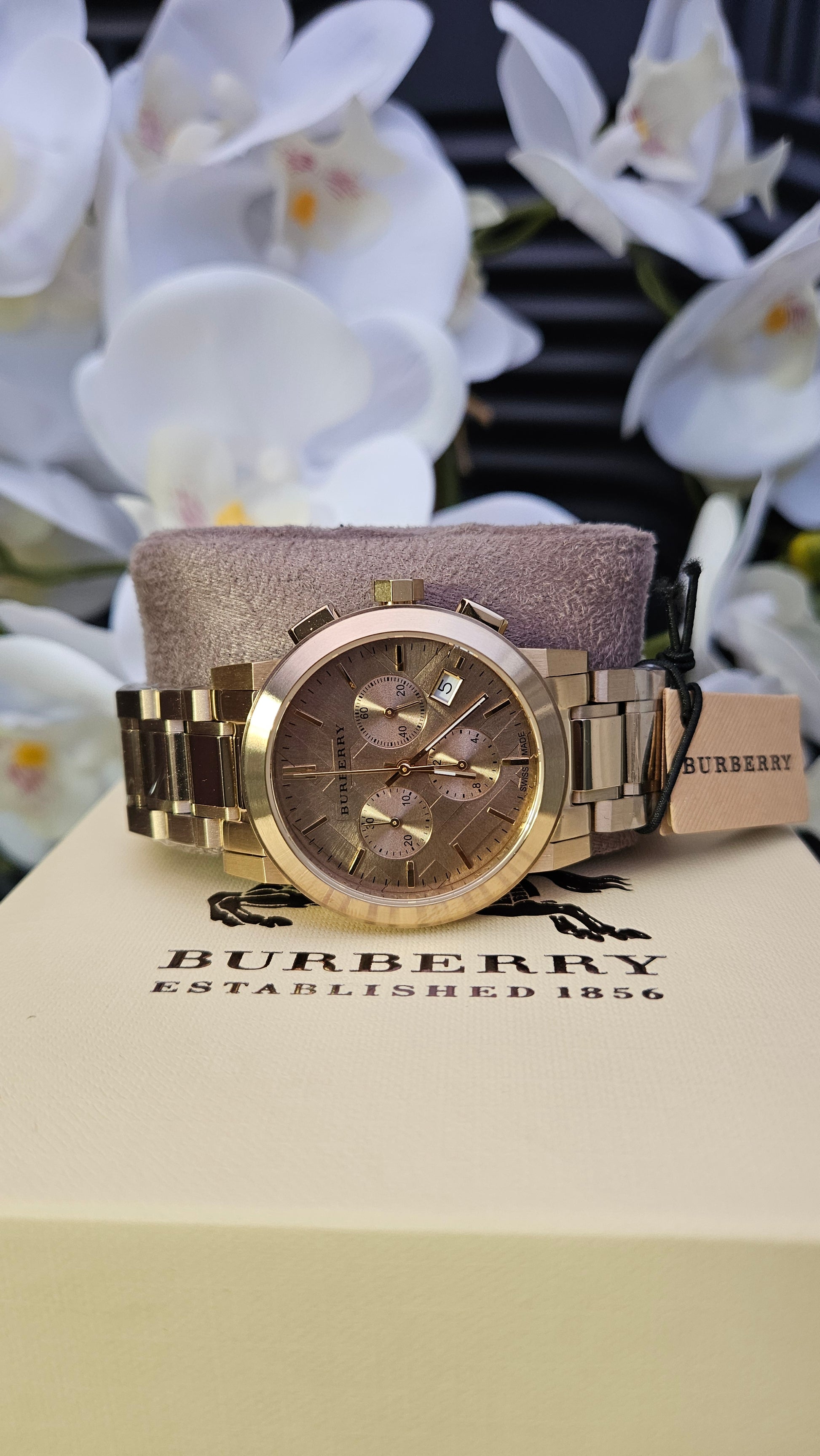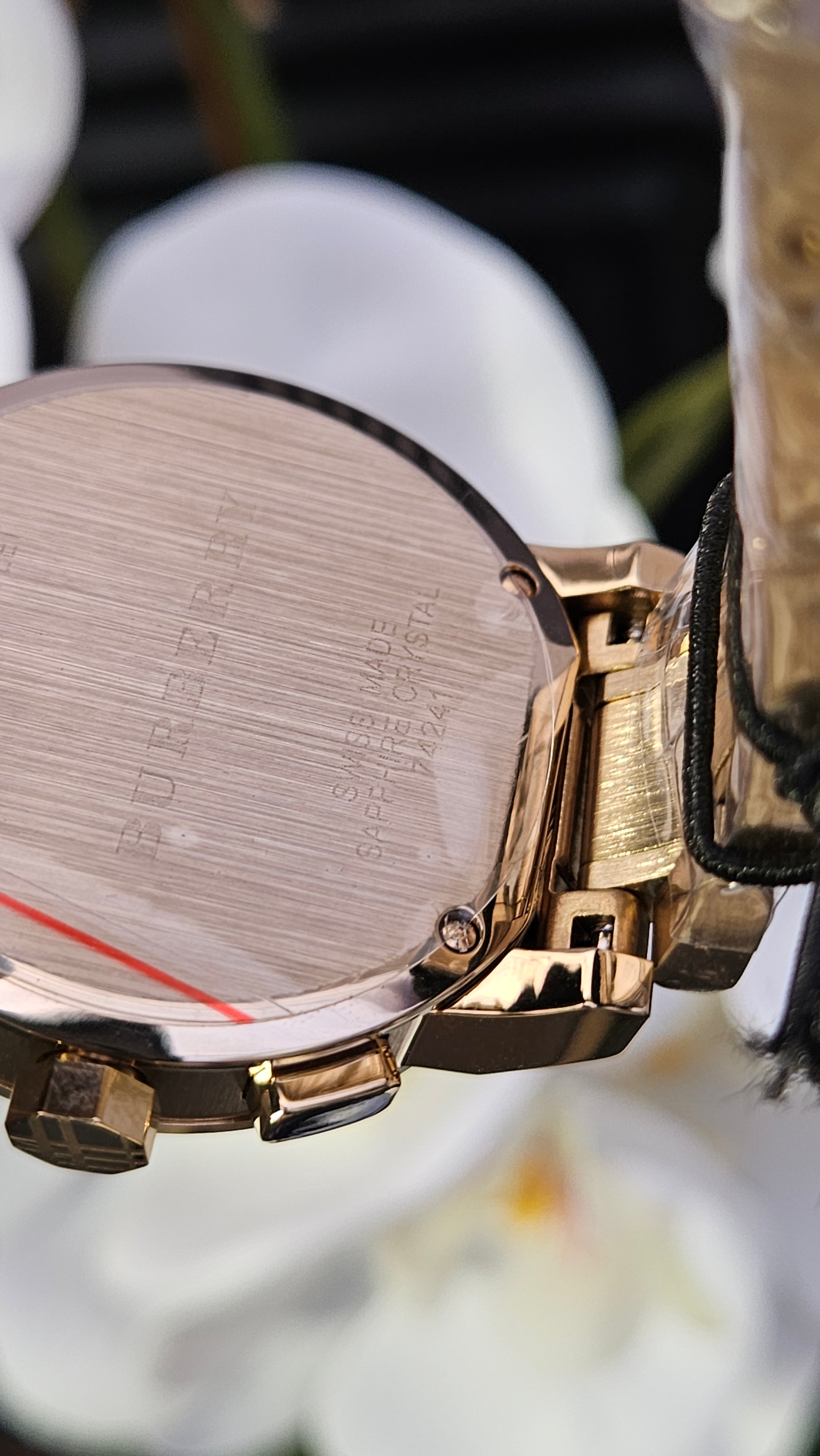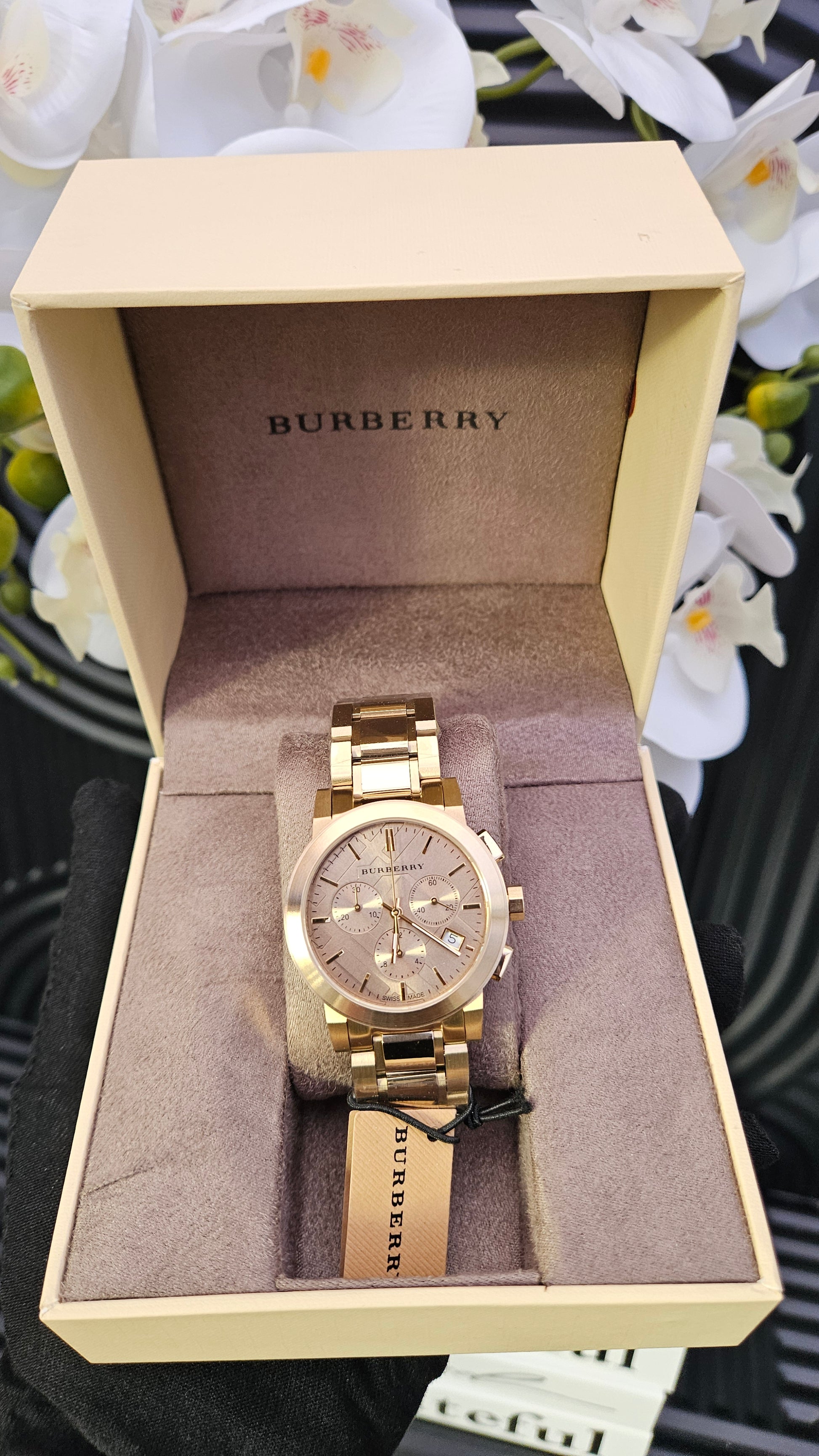 This watch is a classic timepiece for classy fashionistas who want the best of both worlds: luxury and performance. The watch is paved with Yellow Gold, from the polish bezel ring to the deployment clasp. The triple sub-dial design in Yellow gold contributes to the overall appearance of the watch as a chronograph. As with the Burberry tradition, the yellow gold dial features a date window at the 4 ' o clock position for an updated look. And the Quartz movement.