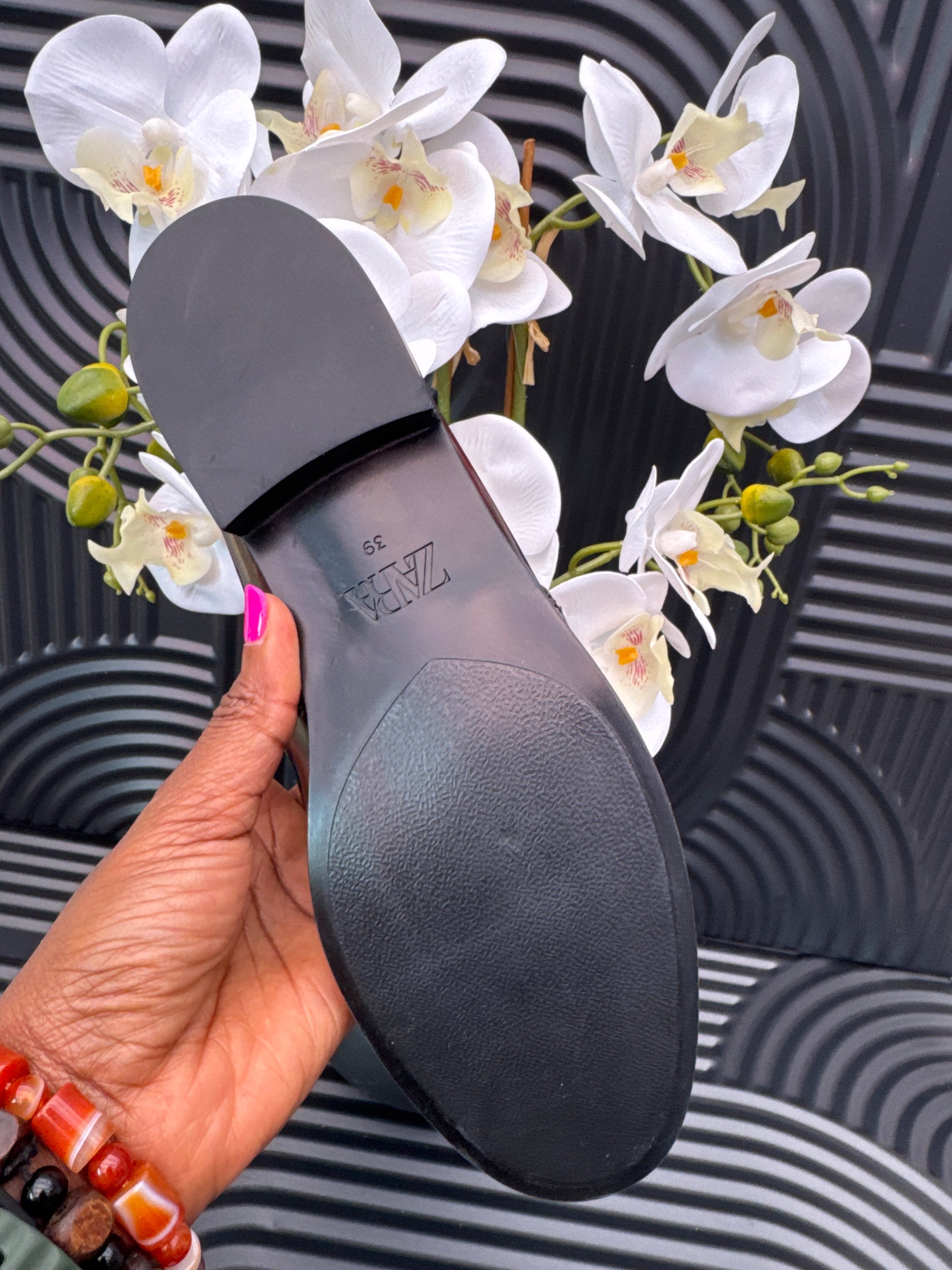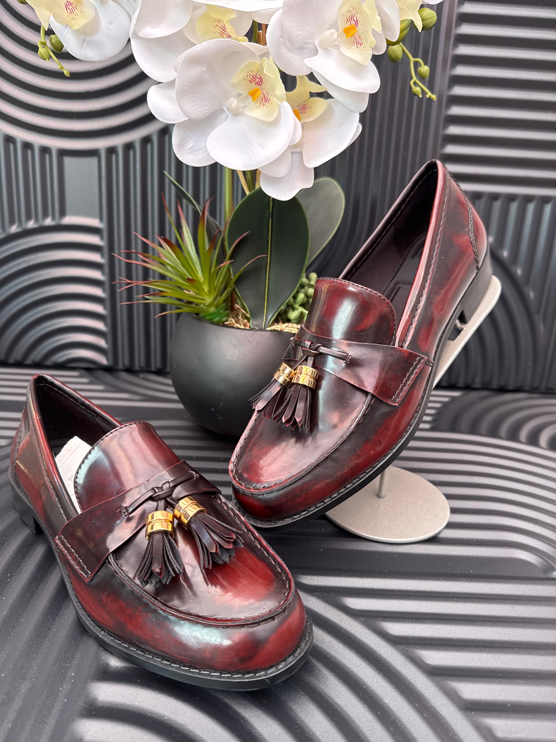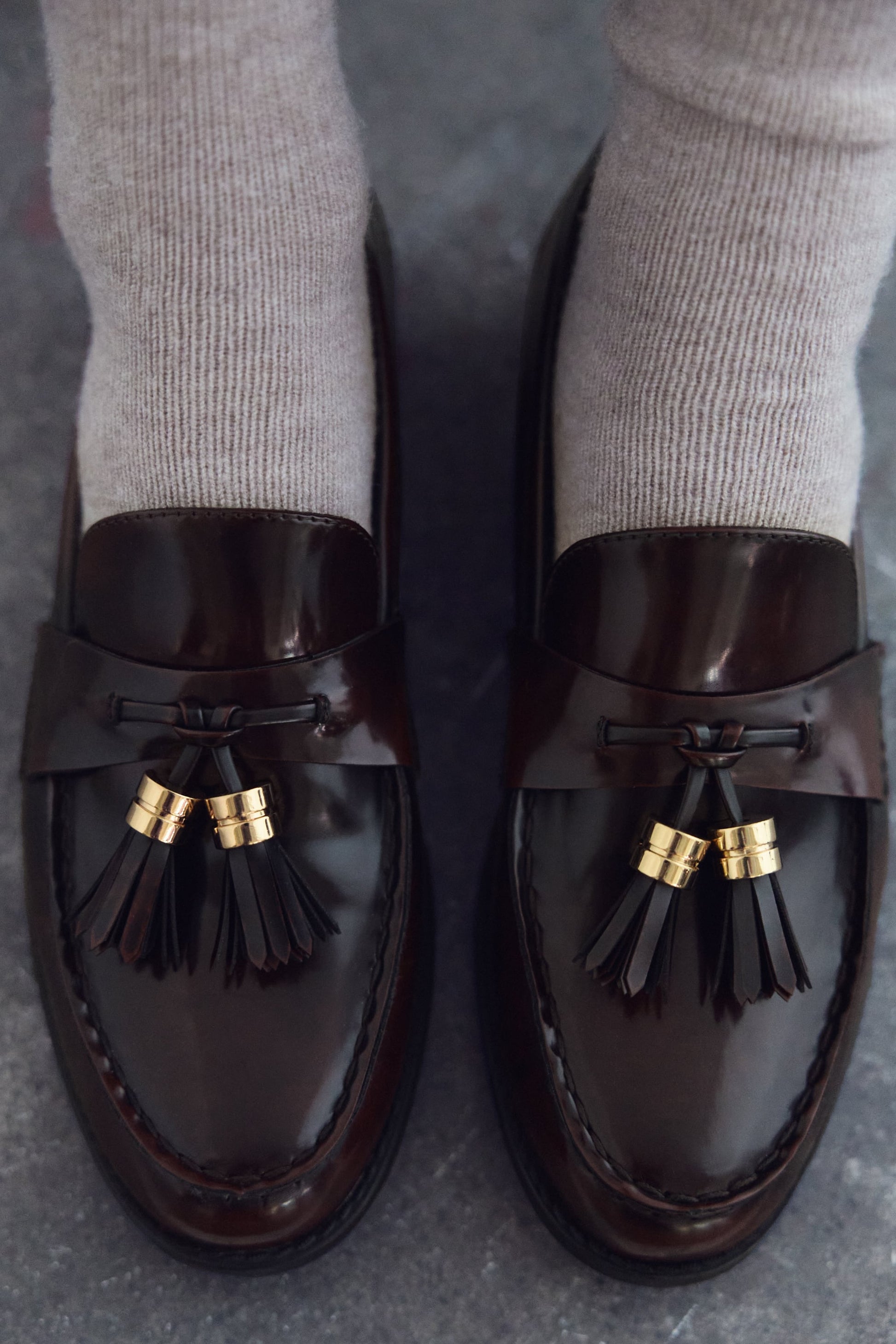 Flat loafers with a faux patent finish. Tassel details with a metal piece on the front. Round toe.