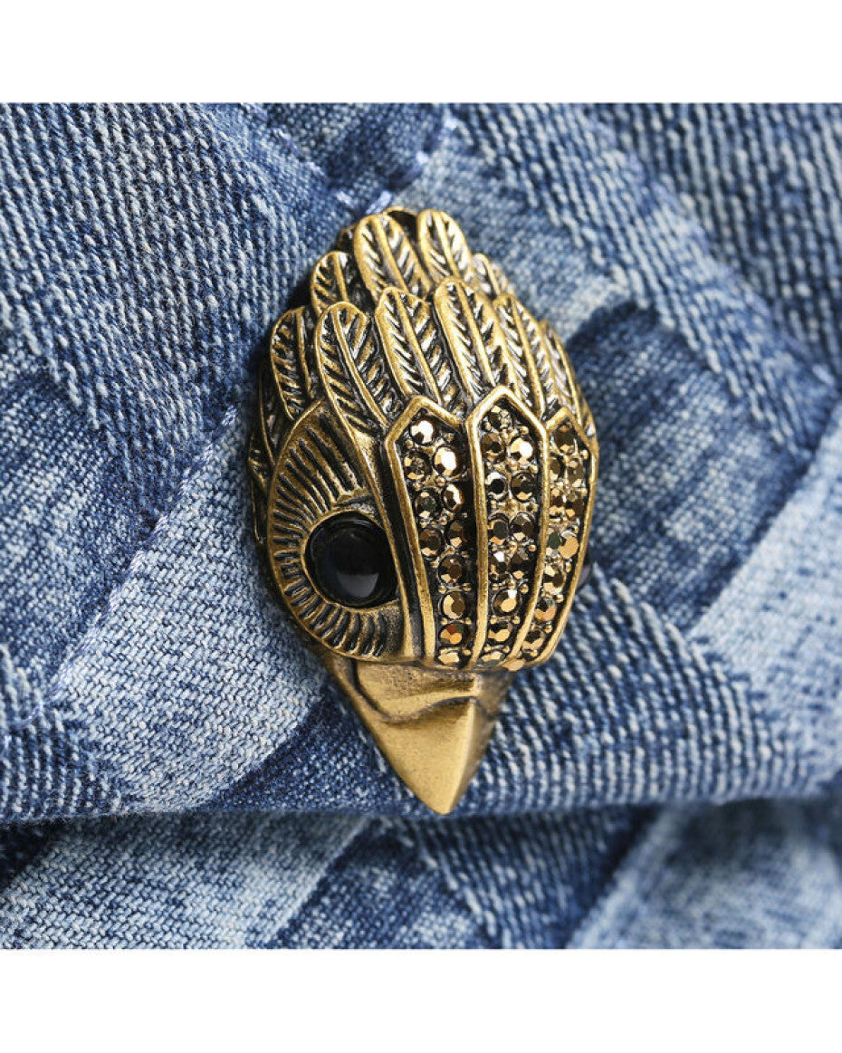 The Soft bag is crafted from an acid wash denim in weave print. The antiqued brass Eagle head features crystals and black bead eyes on the front flap.