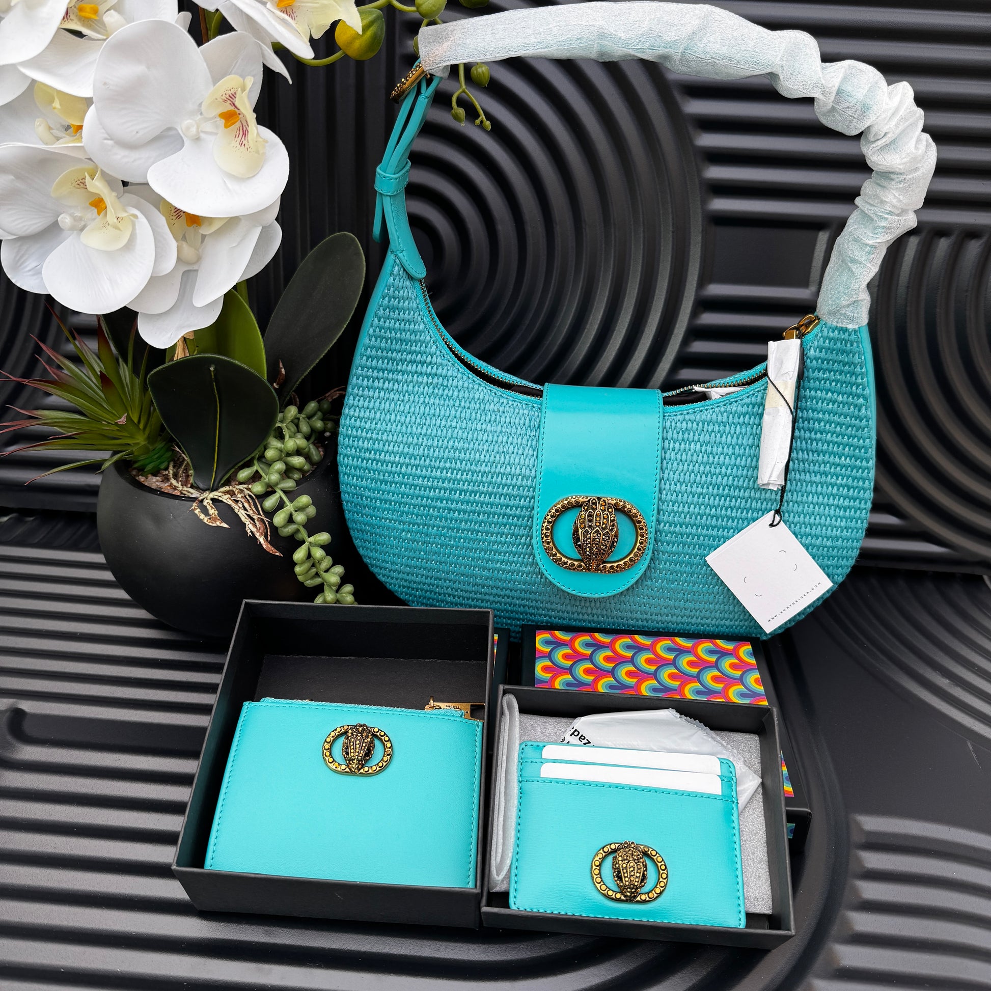 This KG Card Holder is crafted from a beautiful turquoise leather. There is an antiqued brass oval trim with eagle head embellished with crystals on the front of the card holder.