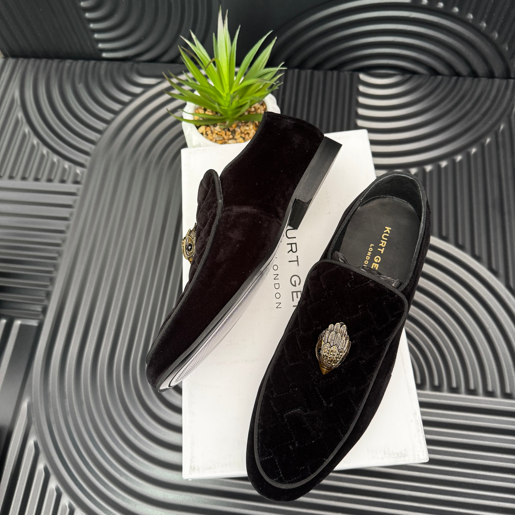 This Eagle Head Loafer features a refined black velvet construction. Designed for effortless wear, it showcases the Kurt Geiger signature quilted detailing on the toe, accented by a vintage silver eagle head. Material: Velvet.