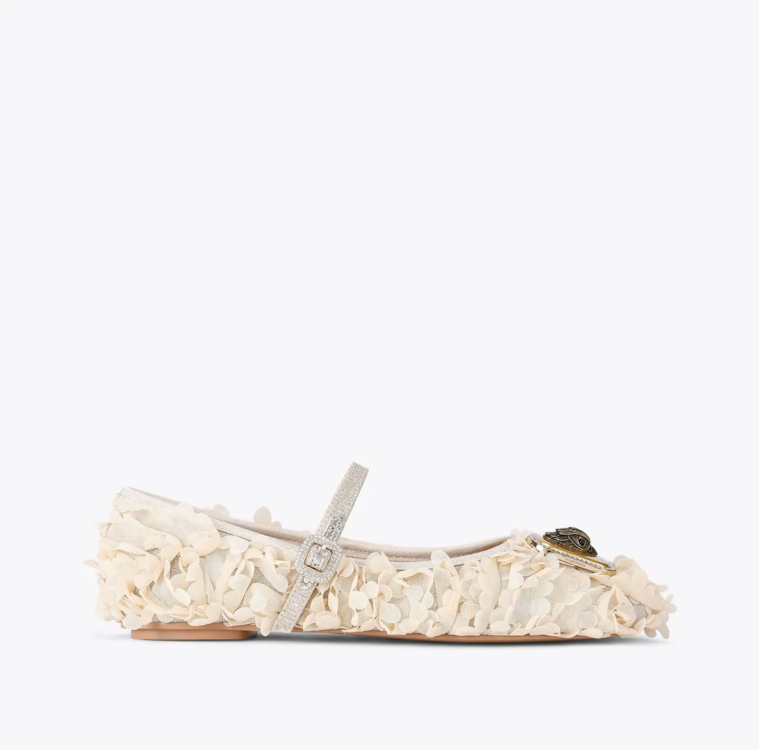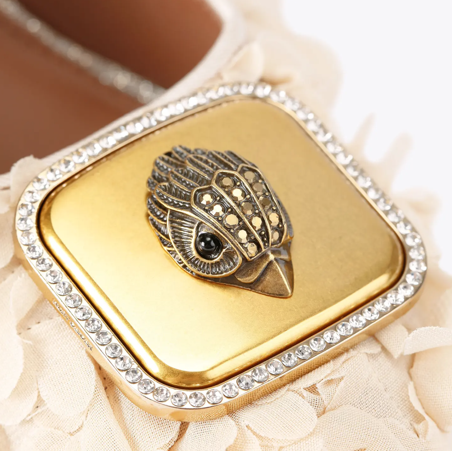 This Ballerina is a simple square toe ballet flat with a pale beige upper in floral fabric. There is an antiqued brass square plaque on the toe with antiqued brass eagle head sat on top.