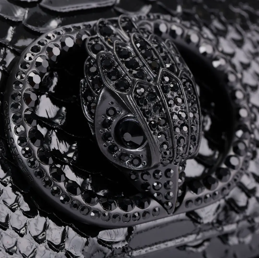 This Long Clutch Bag is crafted from a 3D snake embossed leather. There is a black oval trim on the front with eagle head in the centre.