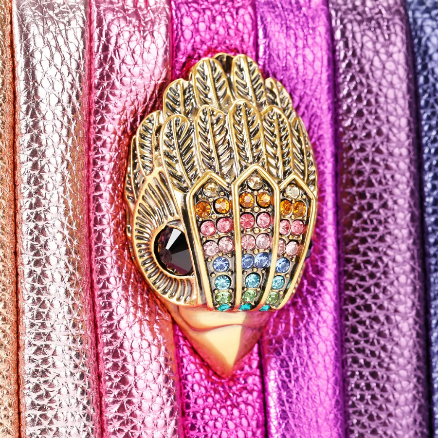 This Cross Body Bag is crafted from a pebble grained leather in a new edition of the rainbow stripe. here is a large antiqued brass eagle head on the front. There are two magnetic pockets on either side of the zipped compartment.