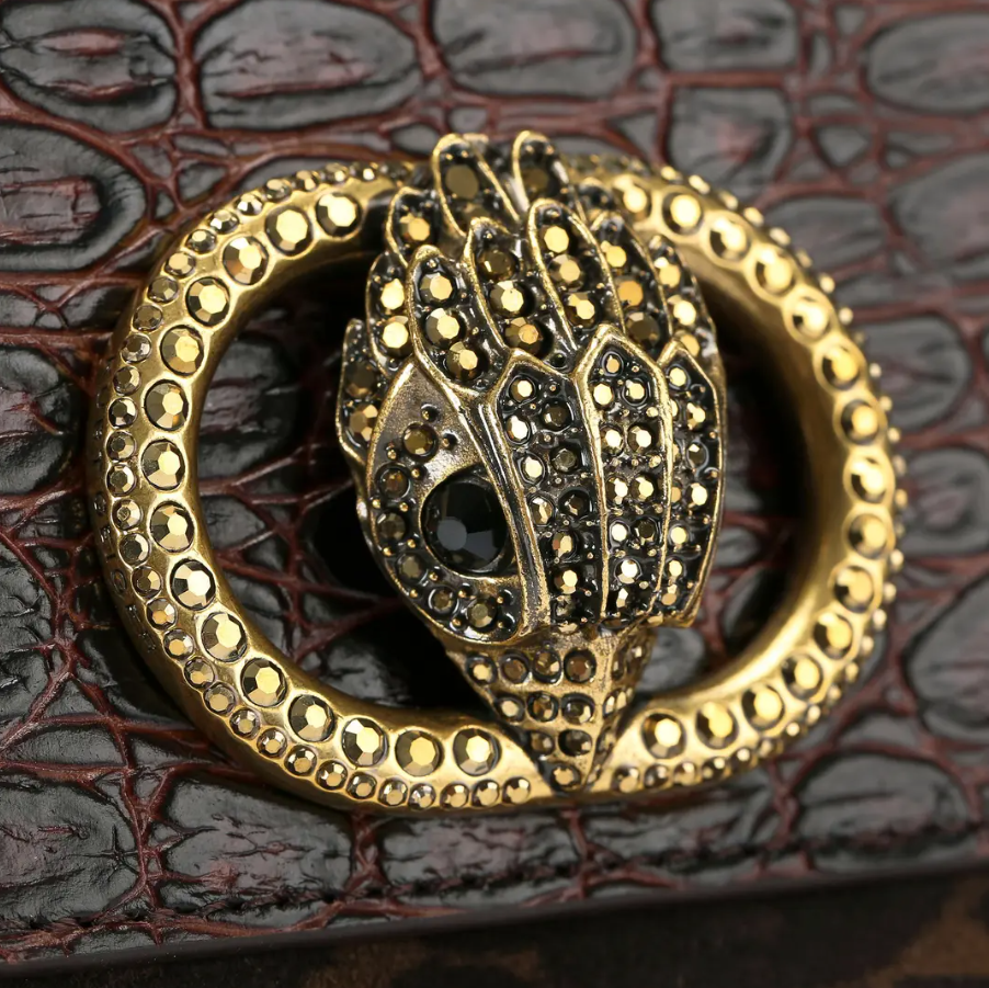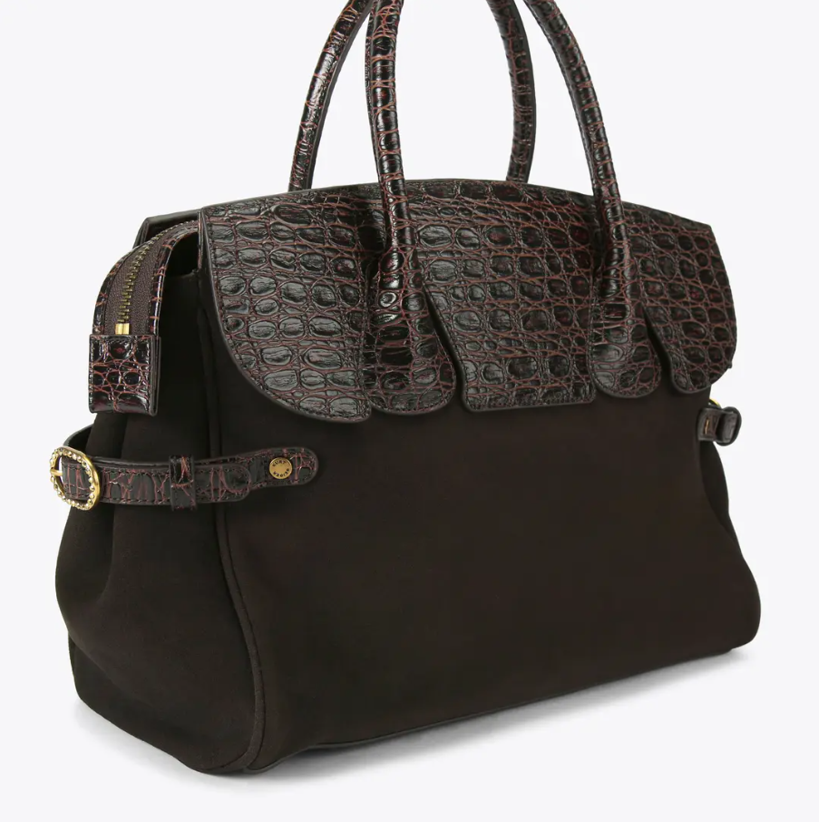 This Large Tote Bag is crafted from a dark brown suede leather and the flap is embossed in a croc embossed style. There is an antiqued brass oval trim with eagle head at the centre embellished with crystals.