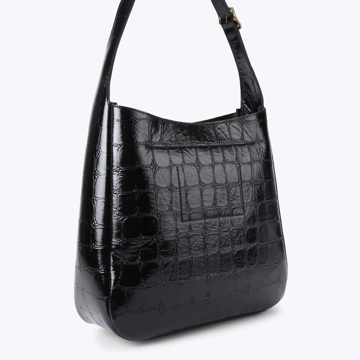 The Large Bond Hobo bag features a patent black croc embossed leather. There is an antiqued brass eagle head on the front above gold foil branding.