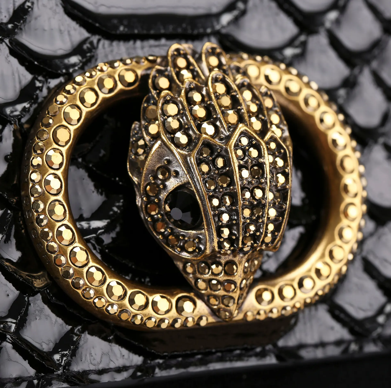 This Tote Bag is crafted from a black suede leather and the flap is in an embossed 3D snake texture. There is an antiqued brass oval trim with eagle head at the centre embellished with crystals.