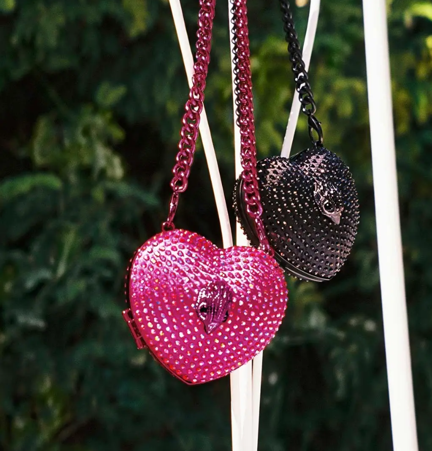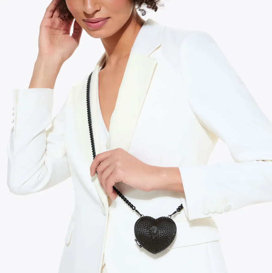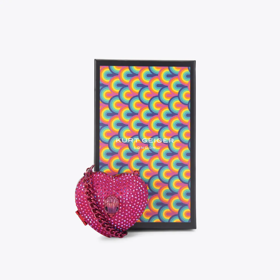 This Micro Heart Clutch bag is crafted from a satin which is embellished with crystals. There is an eagle head sat on the front of the bag.