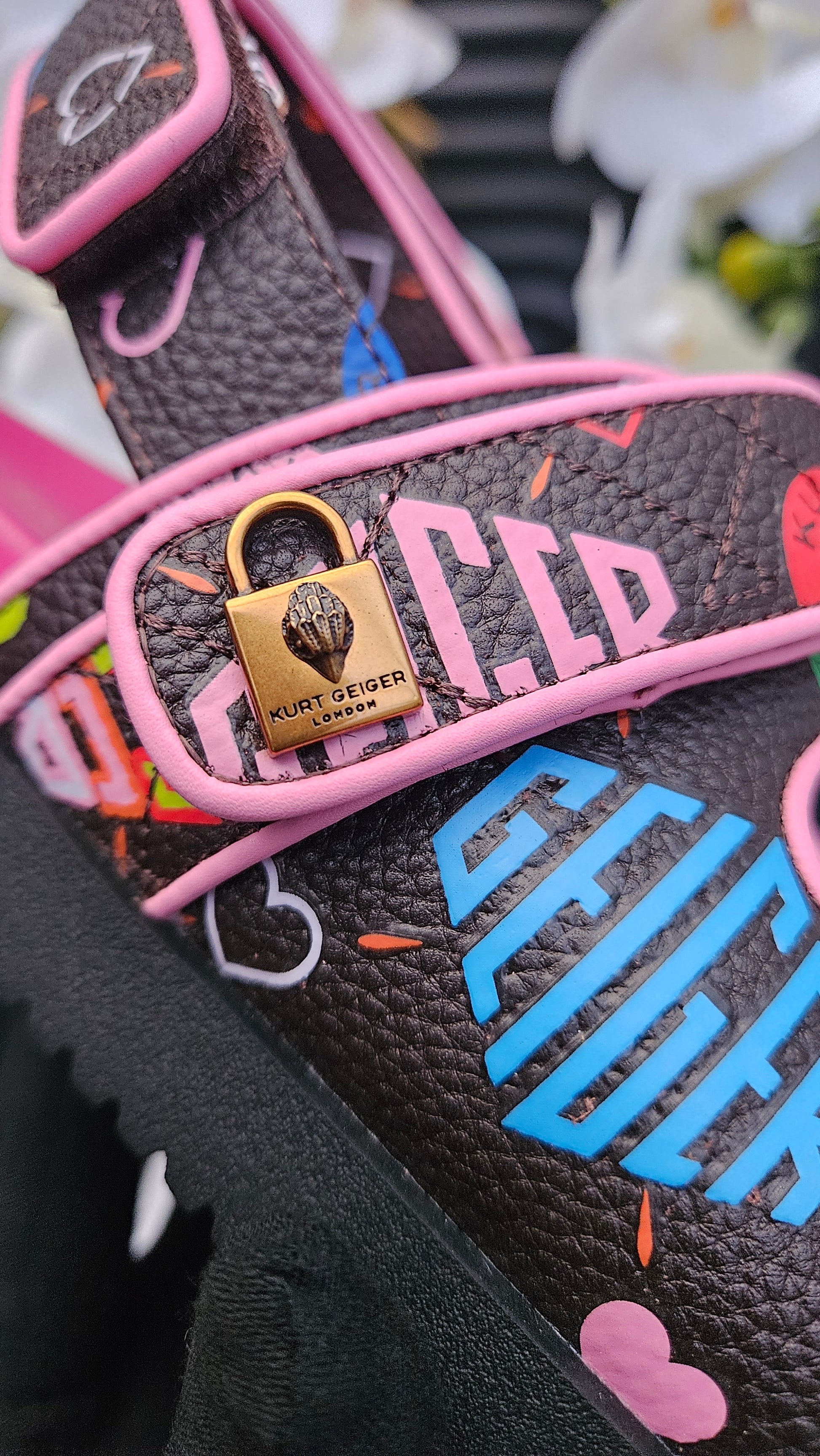 This Sandal is crafted from a brown pebble grain leather which is embellished with Kurt Geiger branding. There is an antiqued brass padlock detail on the upper strap.