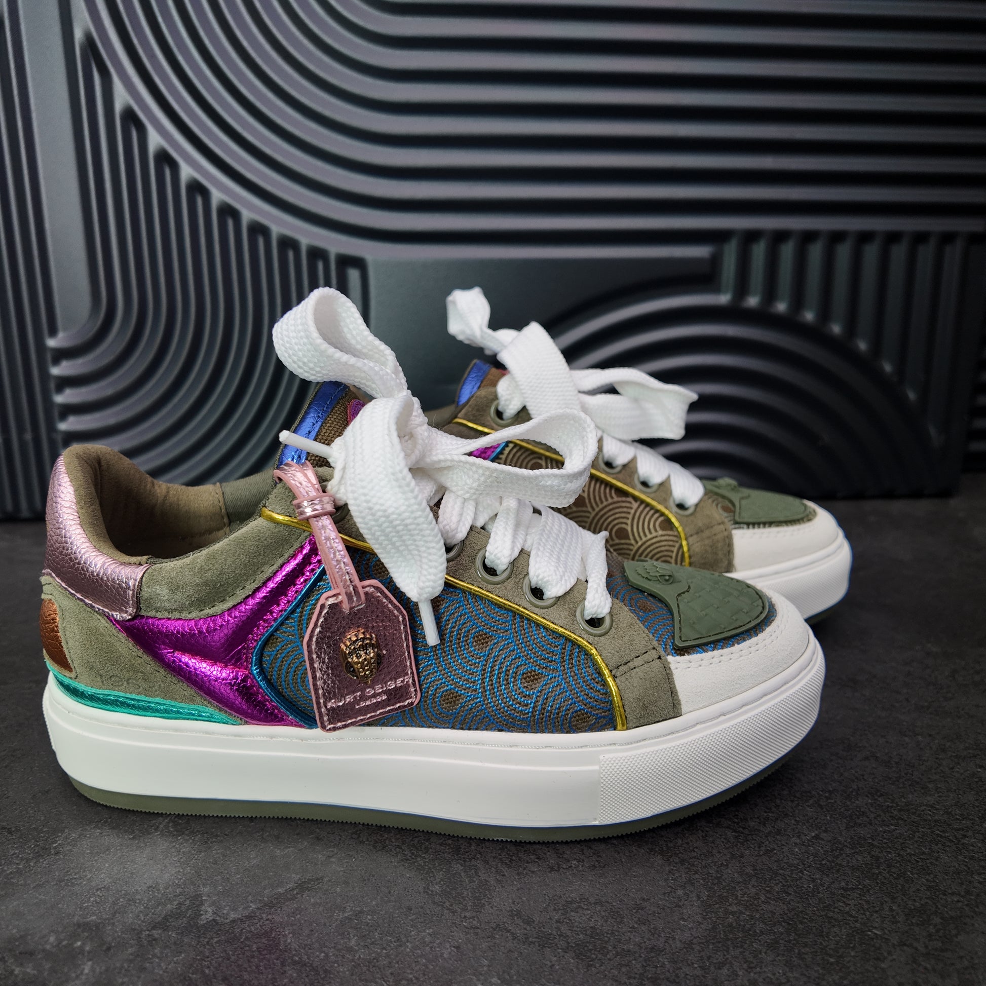 This sneaker showcases an olive green upper highlighted by a blue rainbow pattern along the sides. It includes multi-colored metallic laminated pebble grain cow leather panels and a tag adorned with an antiqued brass eagle head. The sole measures 3.5 cm in height.