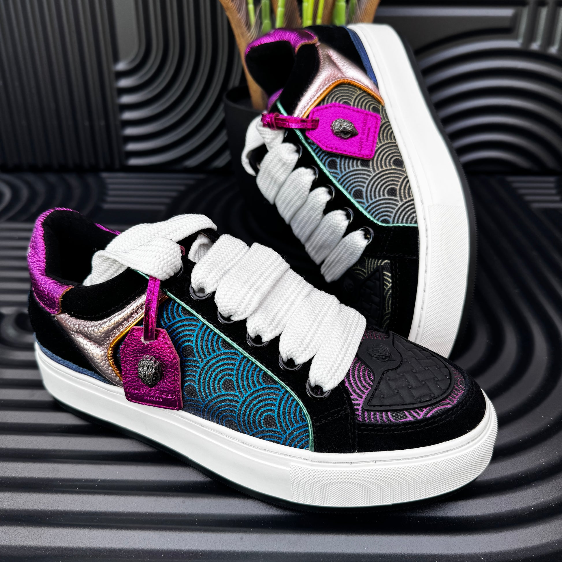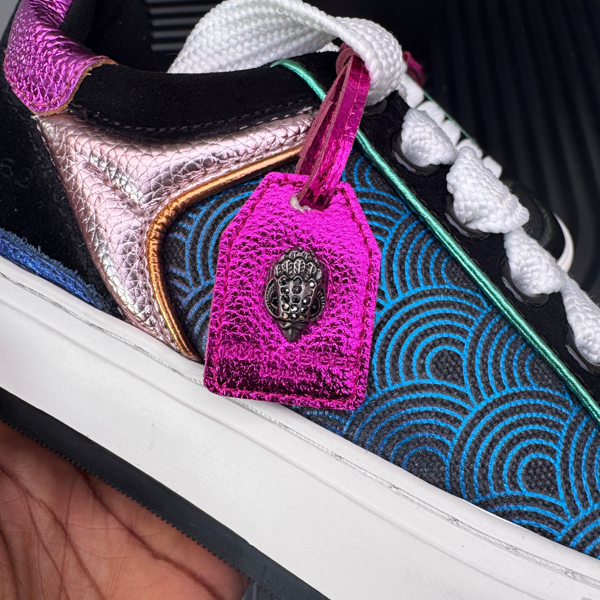 This sneaker features a black upper with rainbow print across the sides. There are multi-colour metallic laminated pebble grain cow leather panels across the shoe as well as tag with antiqued silver eagle head.