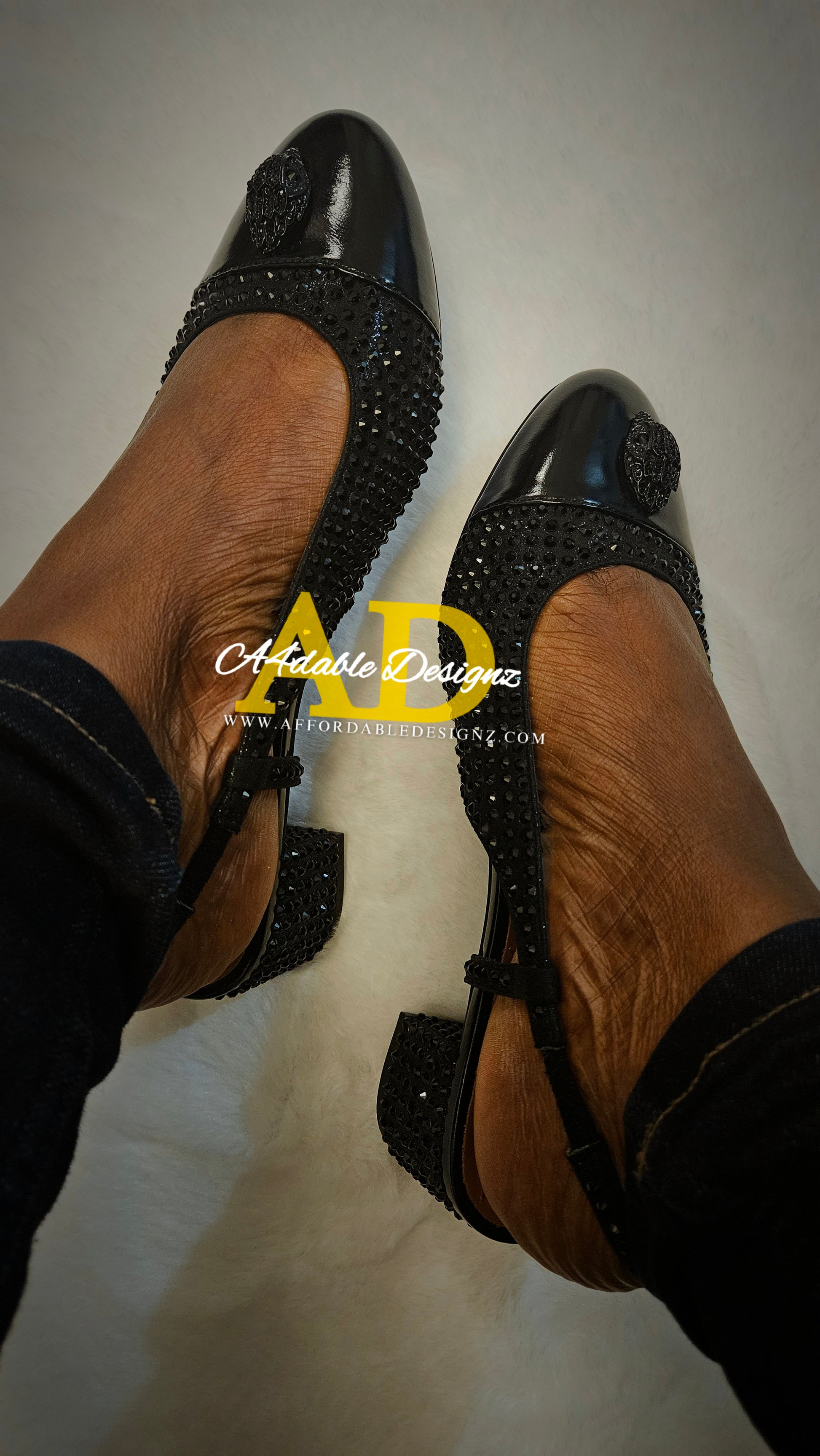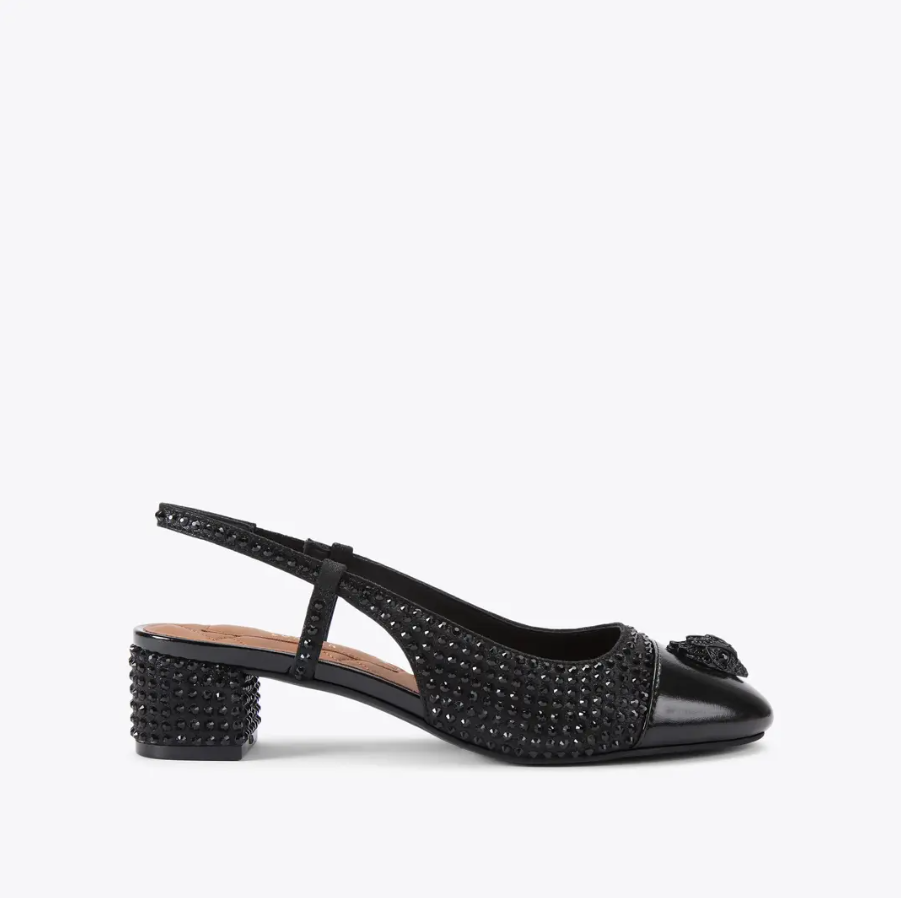 The KG Slingback heel features a metallic black upper with black crystal embellishment. There is a black eagle with crystals on the patent toe cap.