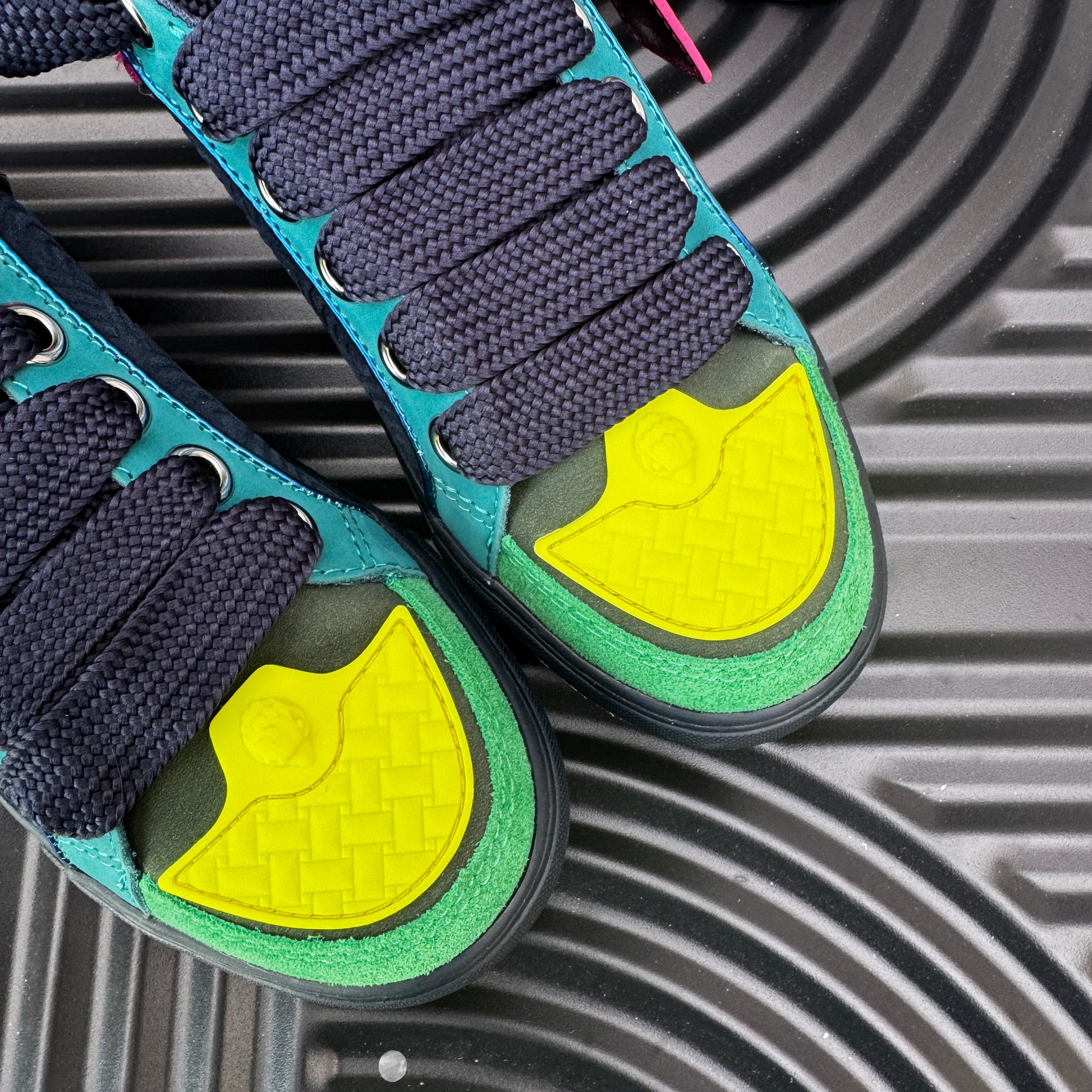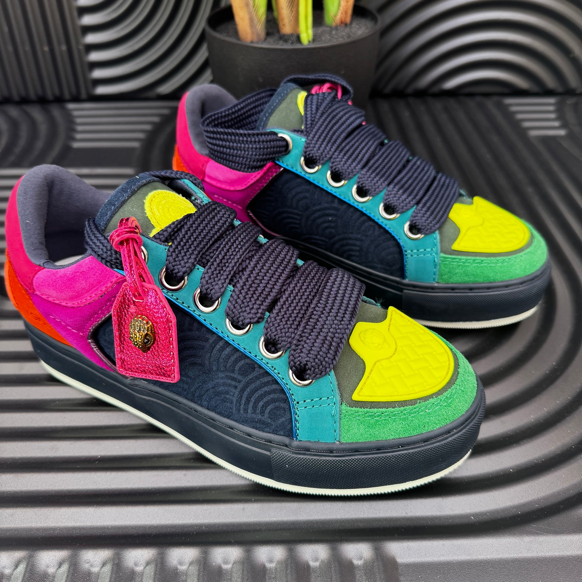 The sneaker features a dark blue upper with rainbow print across the side and toe. There is an antiqued brass eagle head on the small pink tag. The laces are woven and extra wide with silver eyelets.