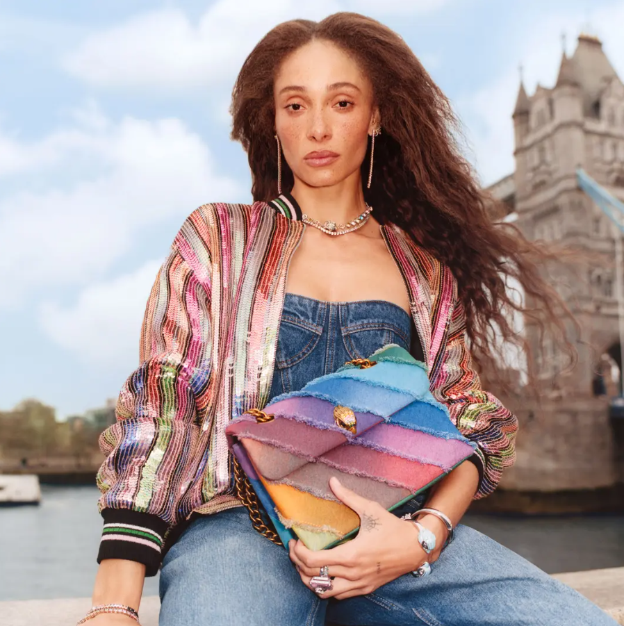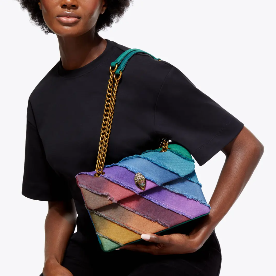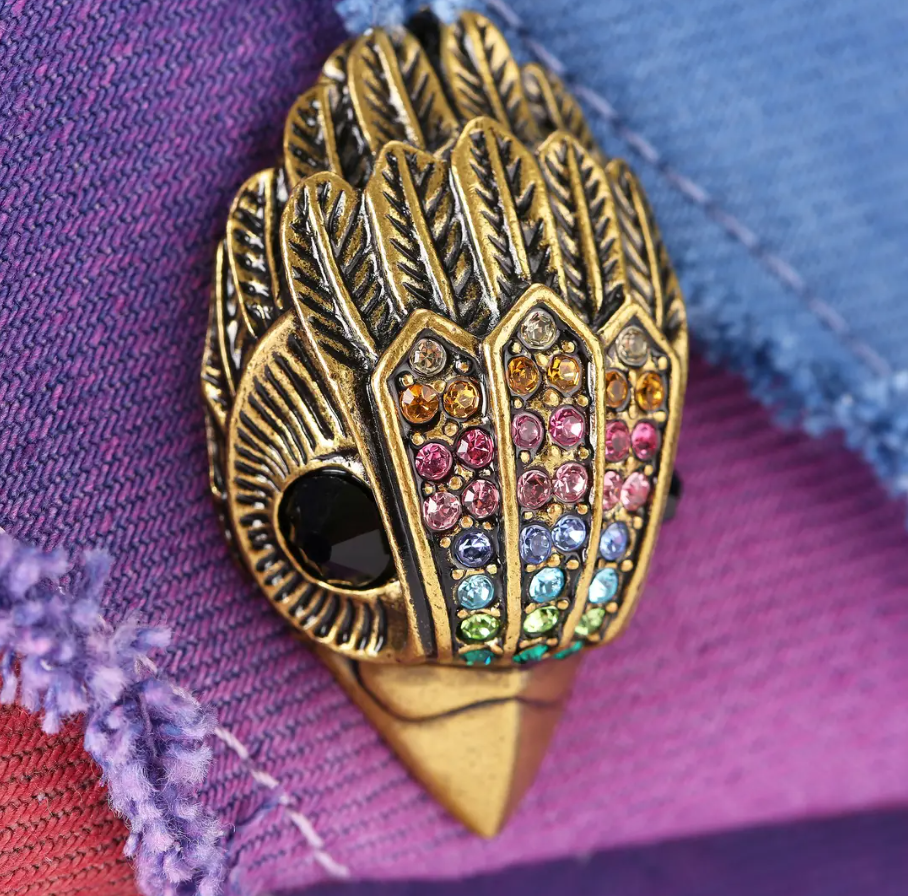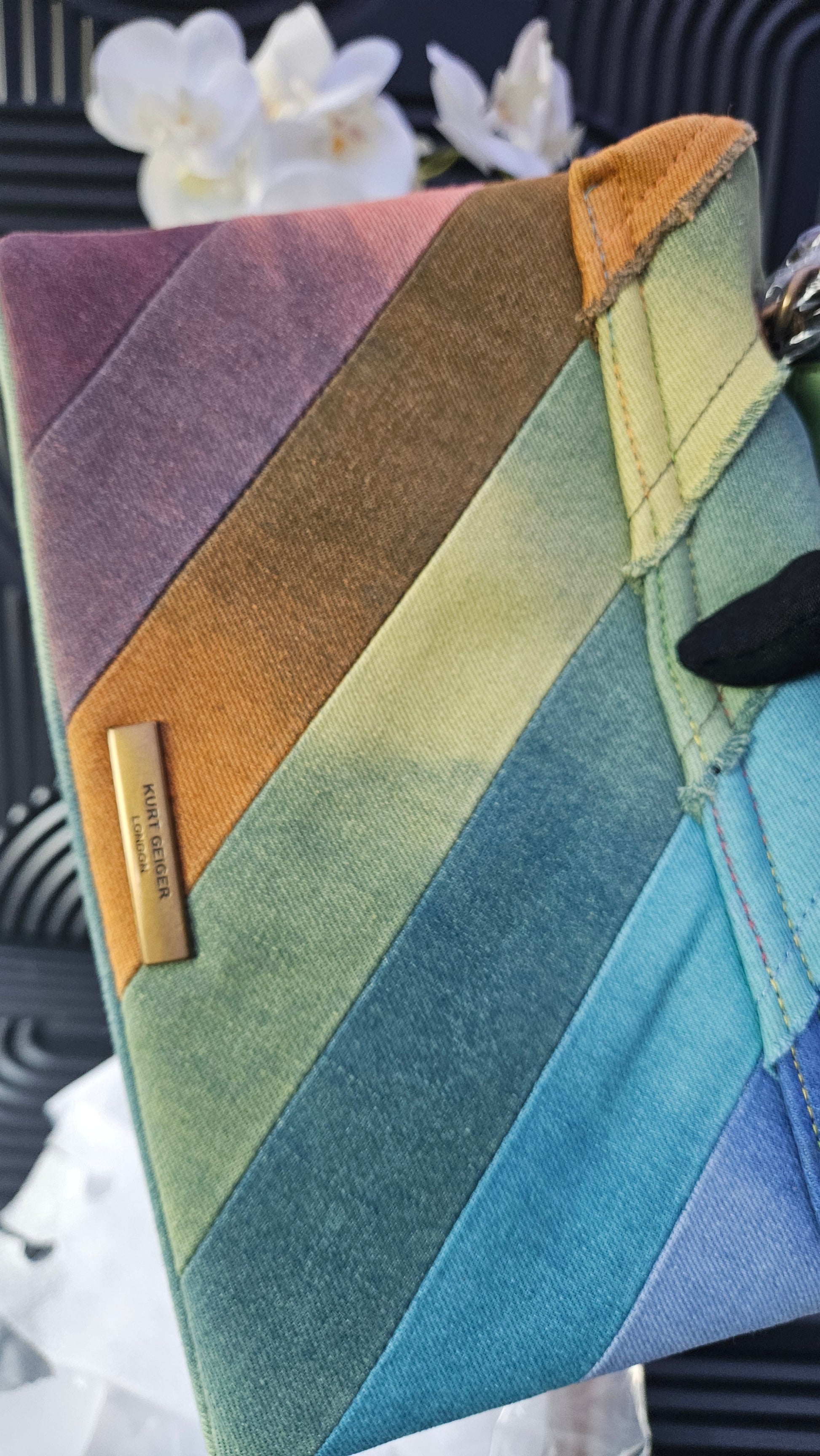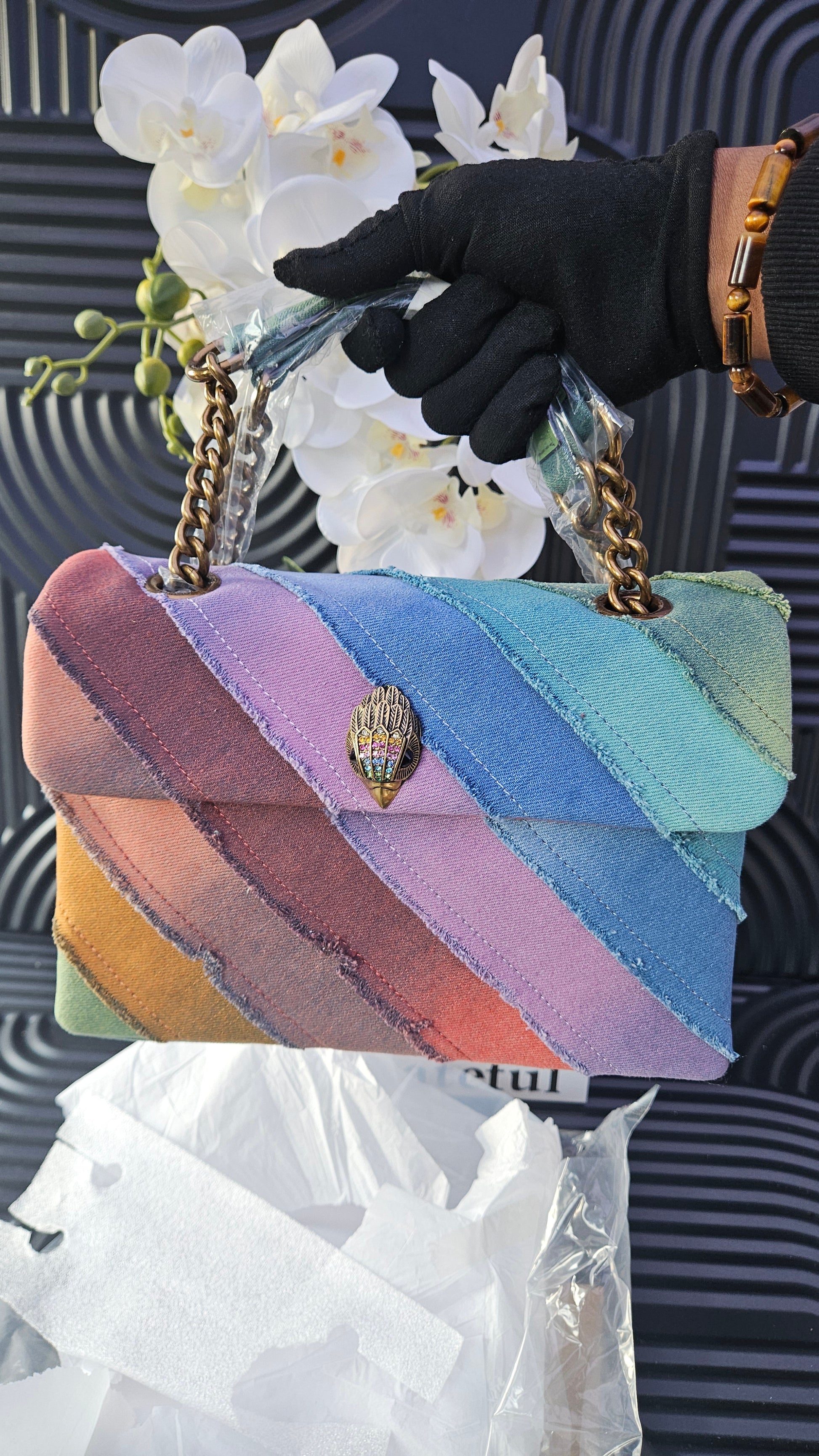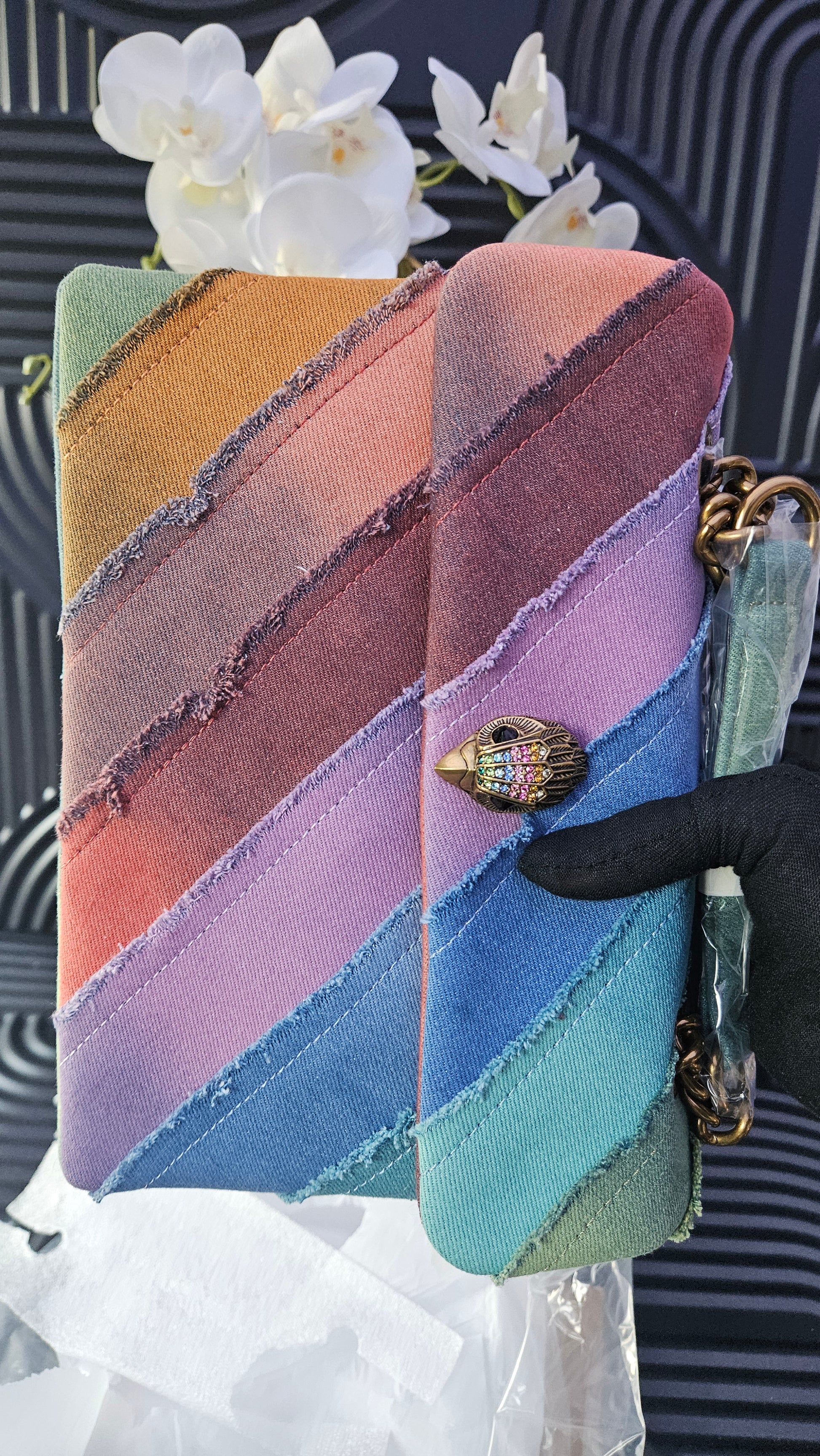 This Large Denim Bag is crafted from a denim fabric with rainbow dyed stripes and fraying details. The antiqued brass eagle head features rainbow crystals on the front flap.