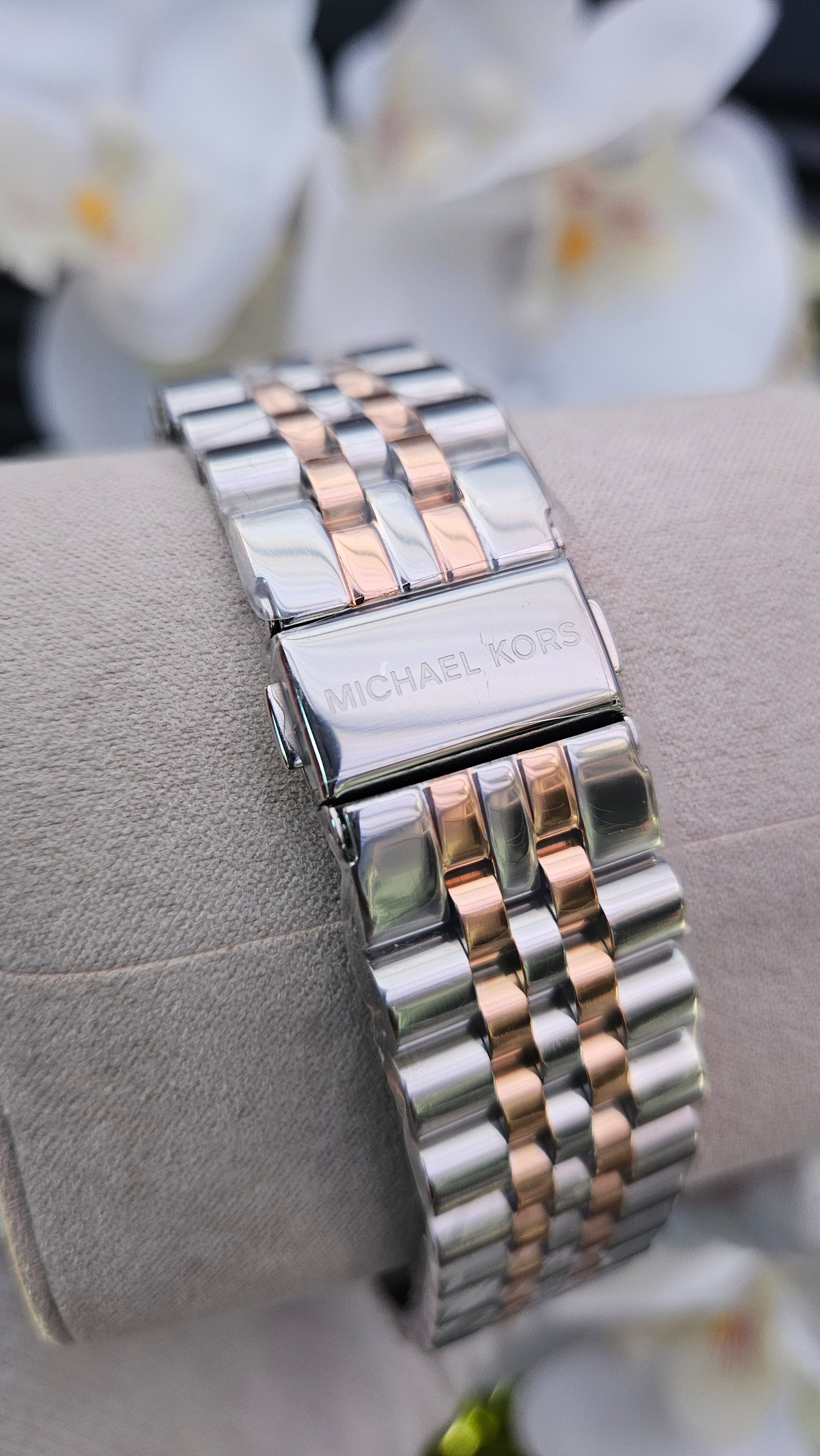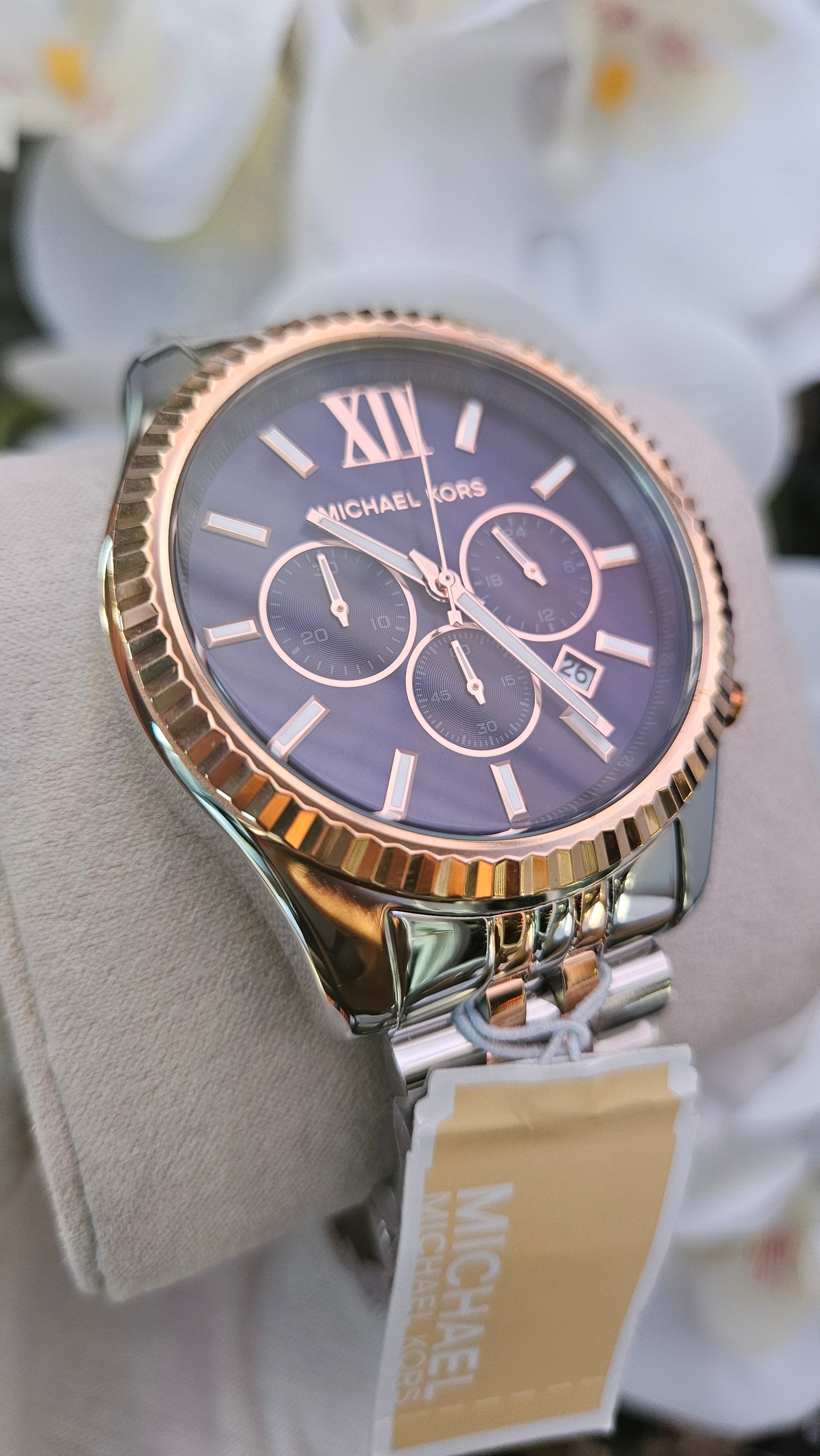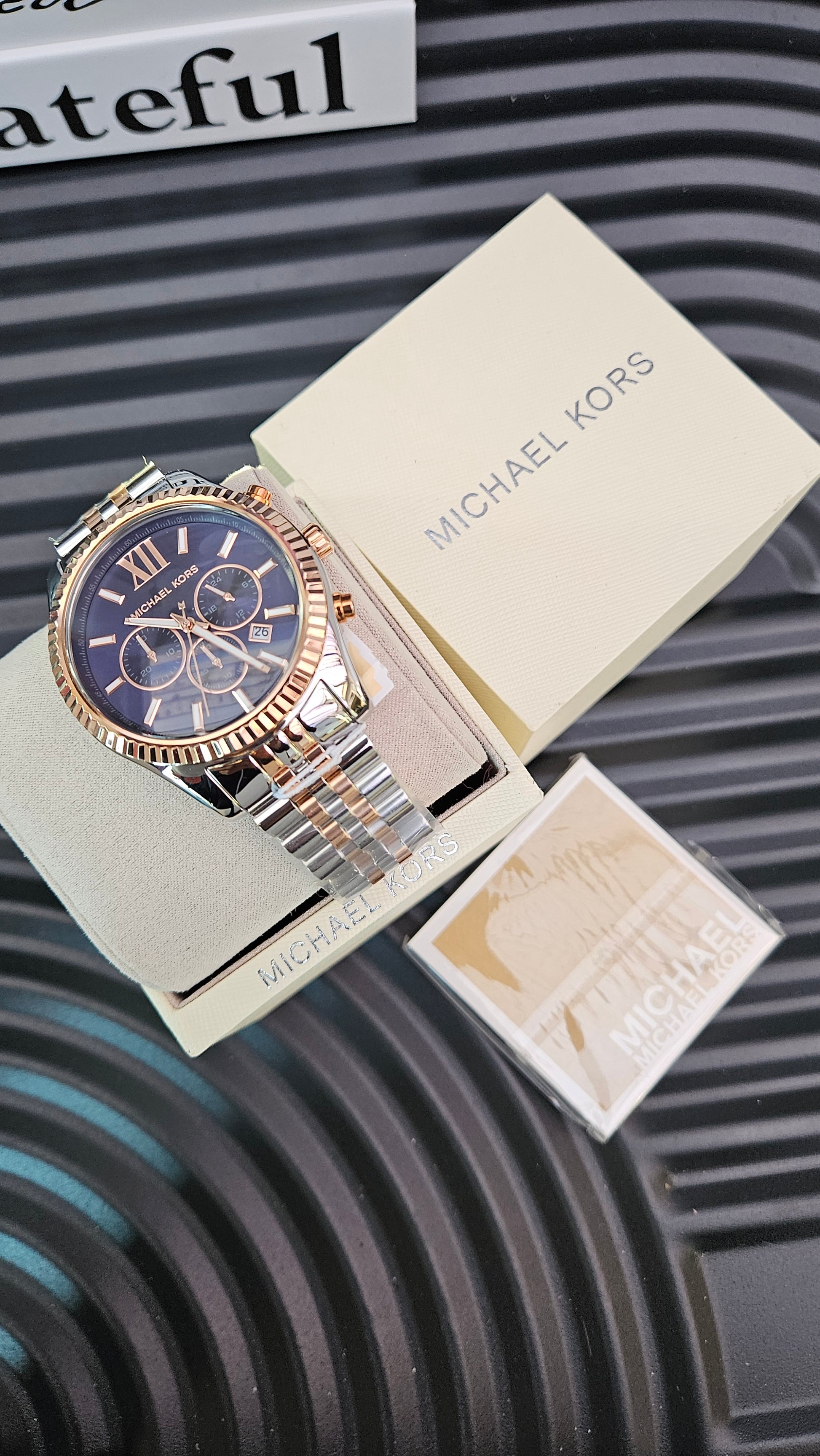 Men's Michael Kors watch in two tone rose gold. (If you are a lady that loves big faced watches too you can rock this- I have attached an image of a lady rocking it just for reference) This model comes complete with date function, chronograph, rose gold baton hour markers and a blue colour dial. It fastens with a two tone PVD rose gold plated bracelet and is powered by a quality Japanese Quartz movement. Comes presented in a signature Michael Kors watch gift box.