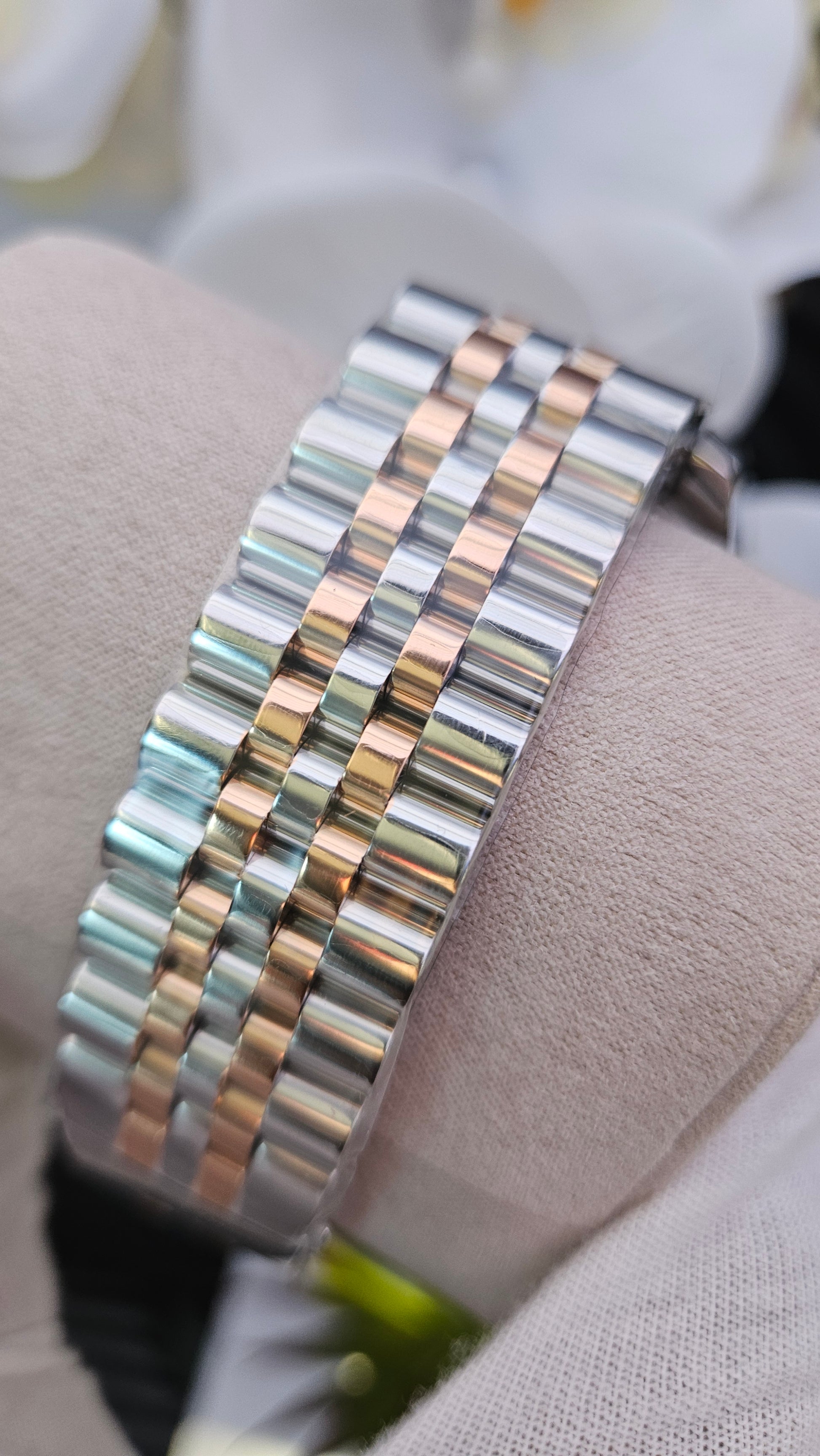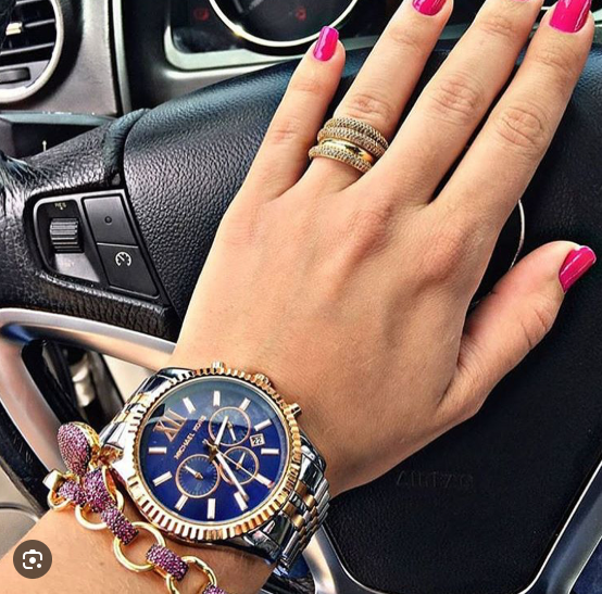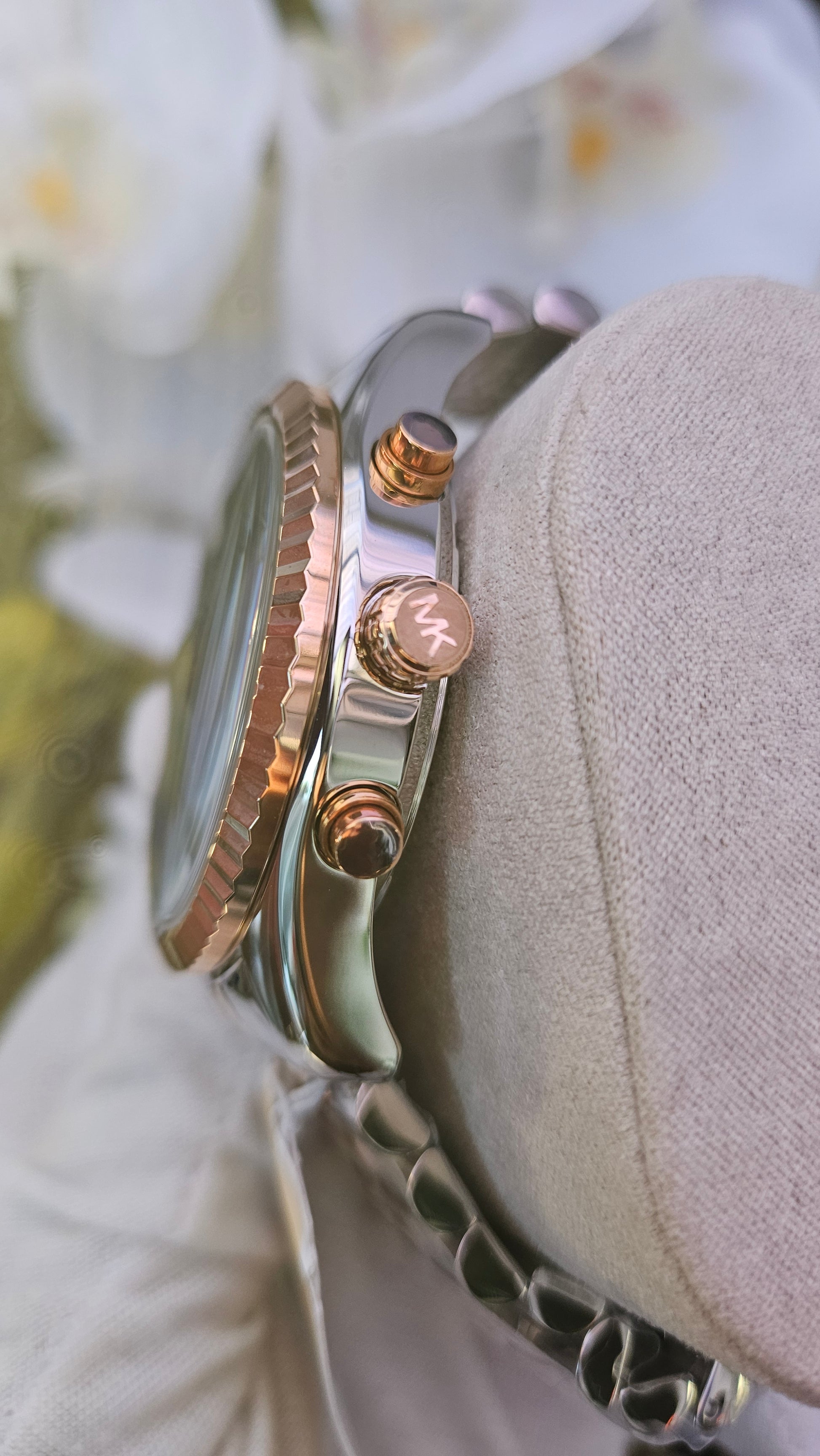Men's Michael Kors watch in two tone rose gold. (If you are a lady that loves big faced watches too you can rock this- I have attached an image of a lady rocking it just for reference) This model comes complete with date function, chronograph, rose gold baton hour markers and a blue colour dial. It fastens with a two tone PVD rose gold plated bracelet and is powered by a quality Japanese Quartz movement. Comes presented in a signature Michael Kors watch gift box.