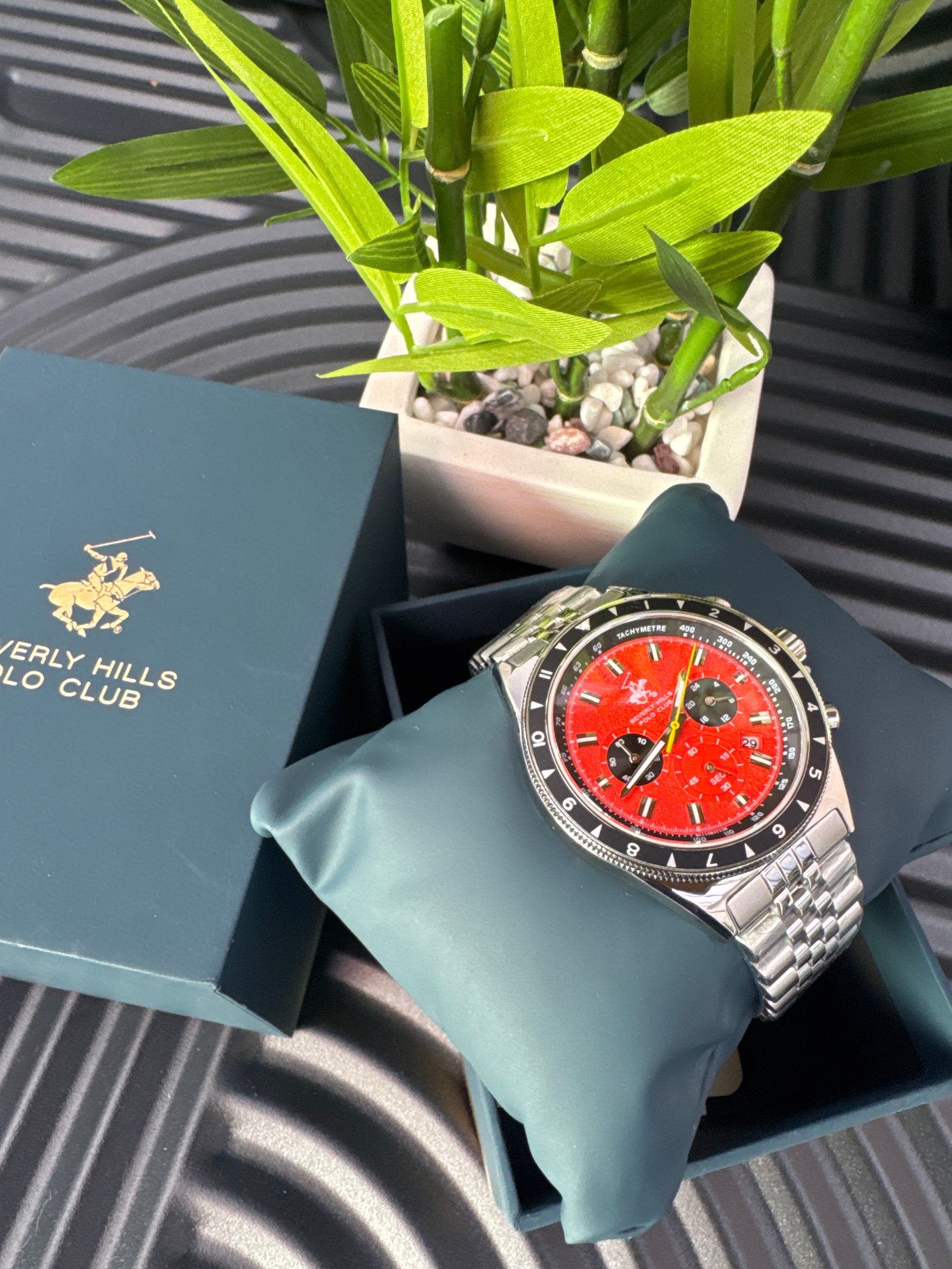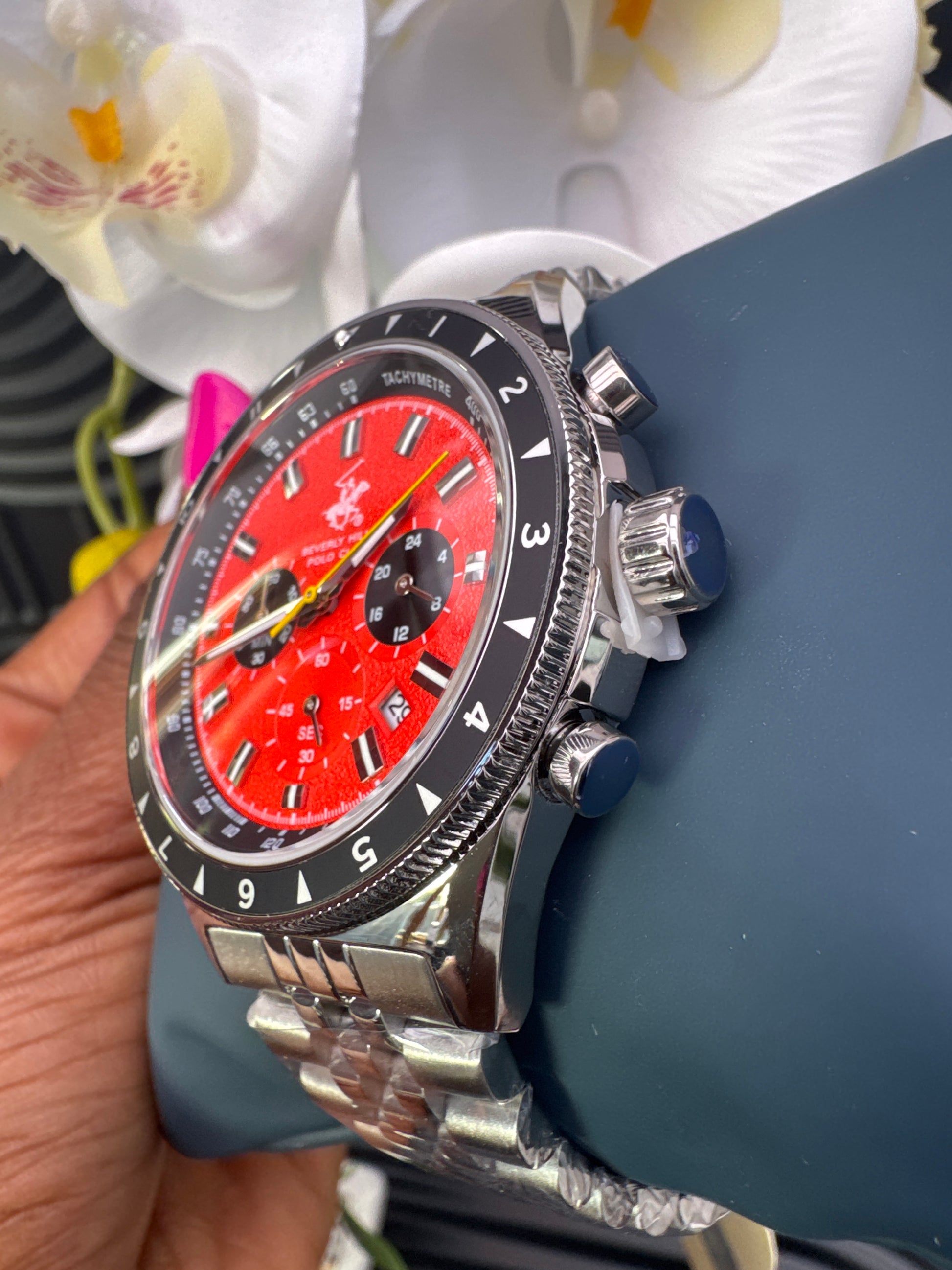 Look charming donning this analog watch by Beverly Hills Polo Club. The metal strap exudes a silver hue that accentuates the look of the watch. Encased in a 45 mm case, the orange tonneau dial is protected by a . It features chronograph. Besides, it is completed with a push-button clasp to ensure a secure fit on the wrist.