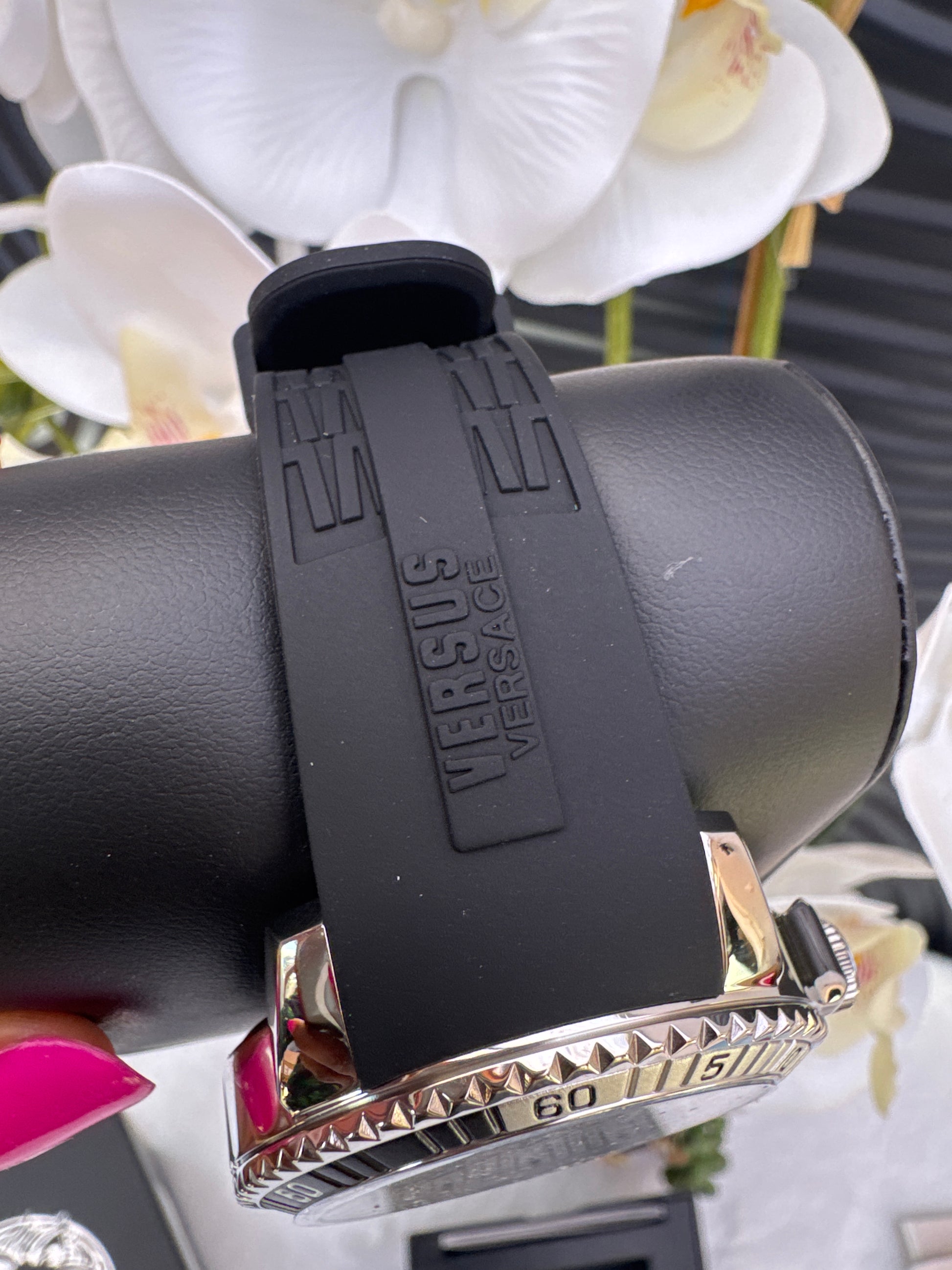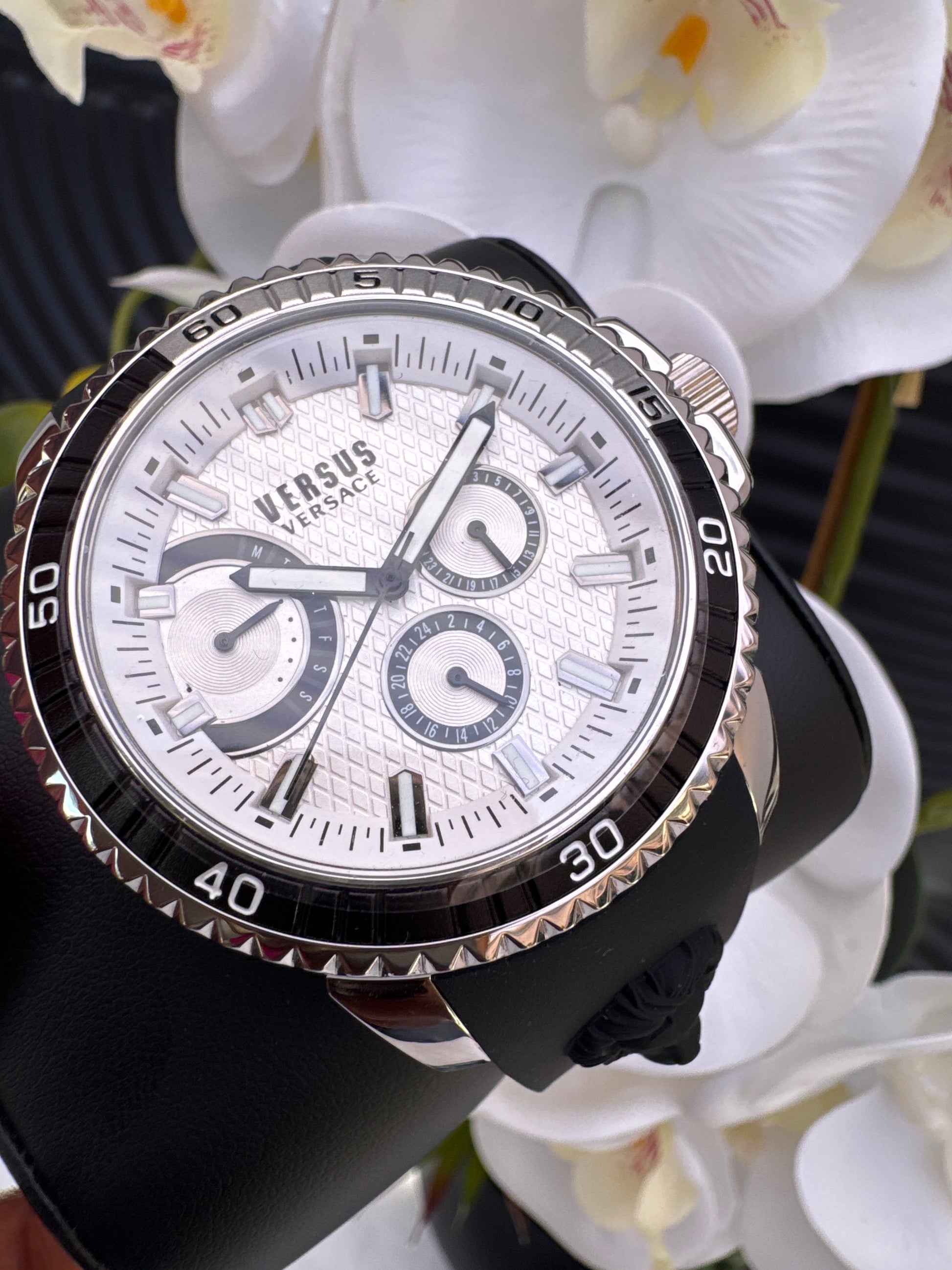 The Versus Versace Chronograph Watch embodies bold sophistication for individuals who exude confidence and vitality. Its refined 45mm stainless steel case frames a pristine white dial, complemented by a resilient black silicone strap that adds a contemporary, sporty flair. Powered by a precise quartz chronograph movement, this timepiece features functional sub-dials and a secure buckle clasp, ensuring reliability throughout your day. With a water resistance of 50 metres, it seamlessly combines durability with elegance, making it an ideal companion for an active, stylish lifestyle. This watch reflects youthful energy with timeless versatility.