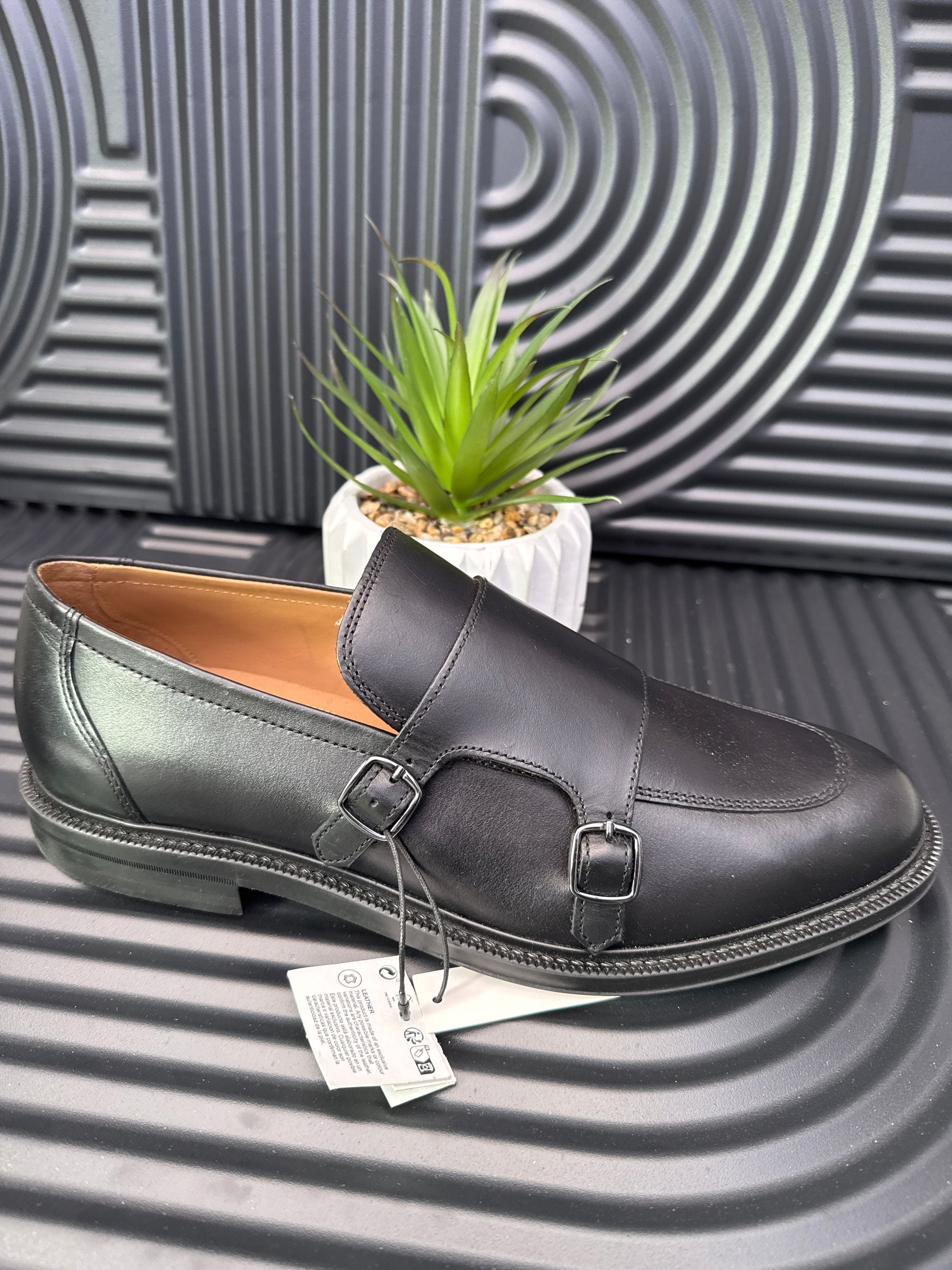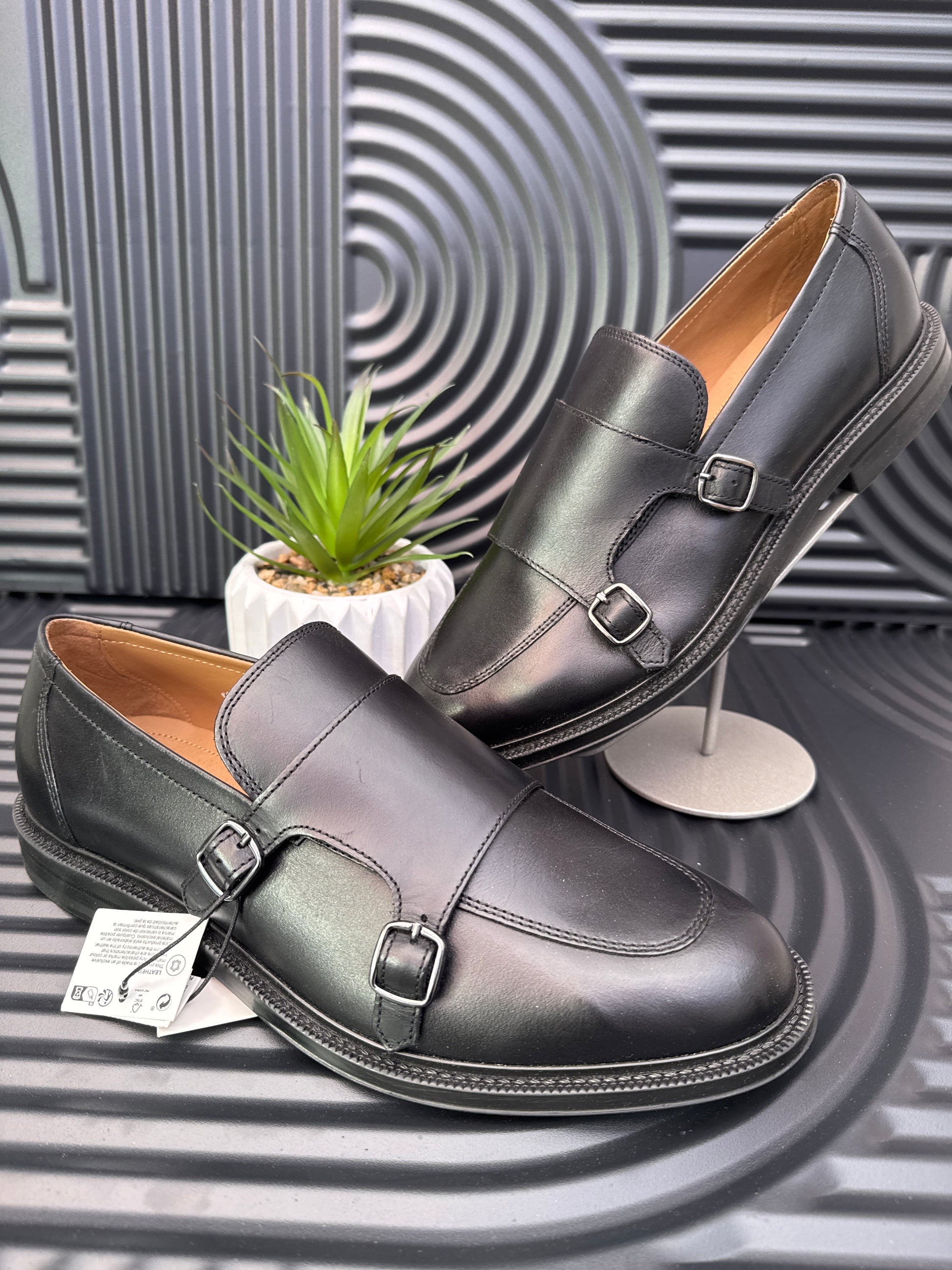 Leather monk shoes. Two metal buckles. Semi-pointed toe. Classic design. Matching sole.